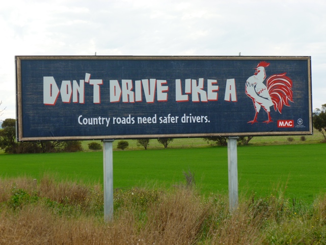 Great road safety banner on the road – only in aus – I think Kerikeri would be too Pc to allow this one to be erected. And just how do Cocks drive?