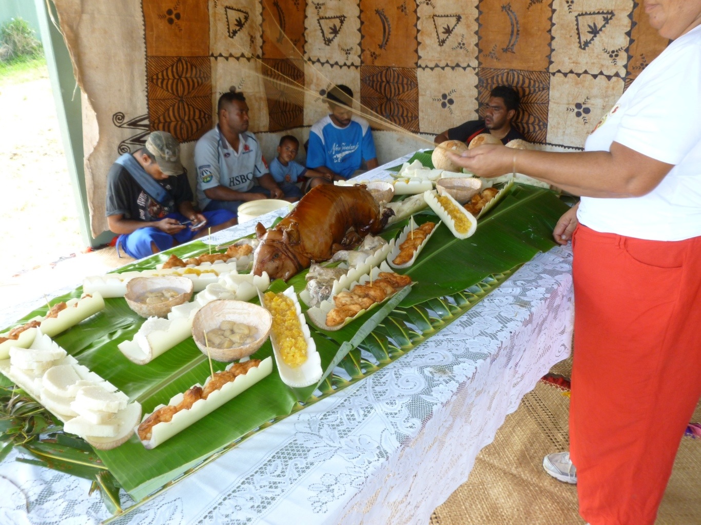 Was a feast for 2 but two Germans from a large yacht did also join us which was as well as it was a large lunch in anyone’s language. Tongan custom Is for guests to eat first and when you have all done they will finish it off. Traditional finger food on banana leaf plates.