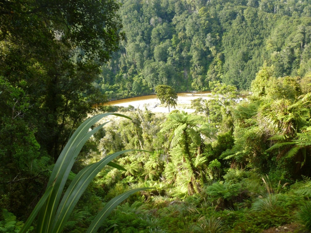 The track was a 700 metre descent all the way down thru mixed podocarp forest. Lots of bird life with curious bush Robins and fan tails to entertain. At the bottom of the descent – 3 hours – we had an early lunch break at Lewis hut – then onwards and over the big bridge on the Heaphy river. The forest is completely different now as we moved thru spectacular Nikau groves along the river banks.