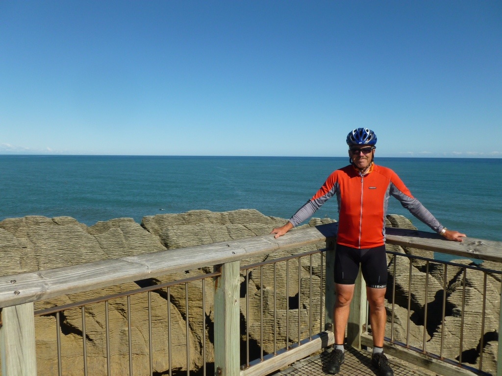 We spent an interesting time at Punakaiki ( pancake rock formations) a catch up with Rod and a chance meeting with a cute Italian cyclist who Ali chatted up , Allesandra , she posed for our team photo.