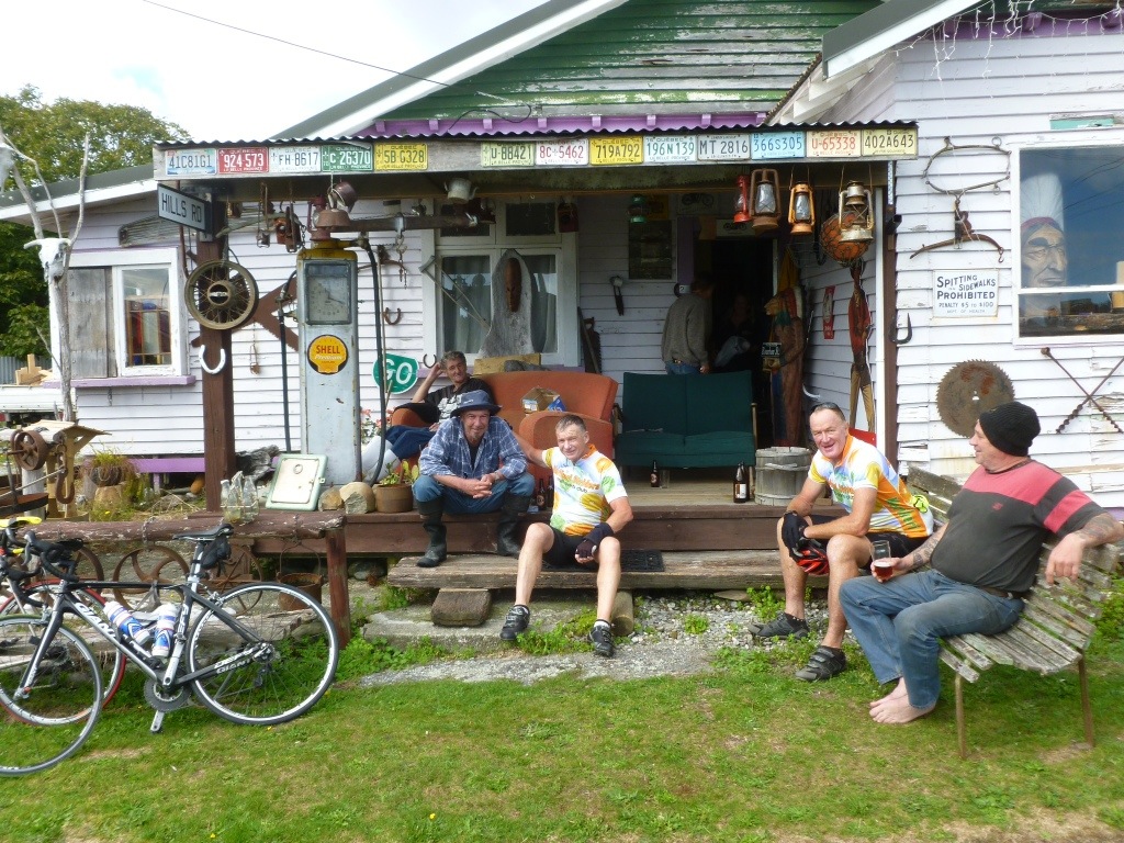 We had an interesting stop at a small gold mining settlement of Ross and got to chat to the locals who have this very unusual house right on the corner of the main rd thru Ross. We got to meet a guy named Ray. Knight who was a serious cyclist in a former life- mainly trackie – who was from Christchurch. he won a bunch of national awards in the early 70’s Ray has given up on the bike but admits to the odd ride on the ” local bicycle” Mostly now they just drink beer and watch the world go by , which they were doing at midday.