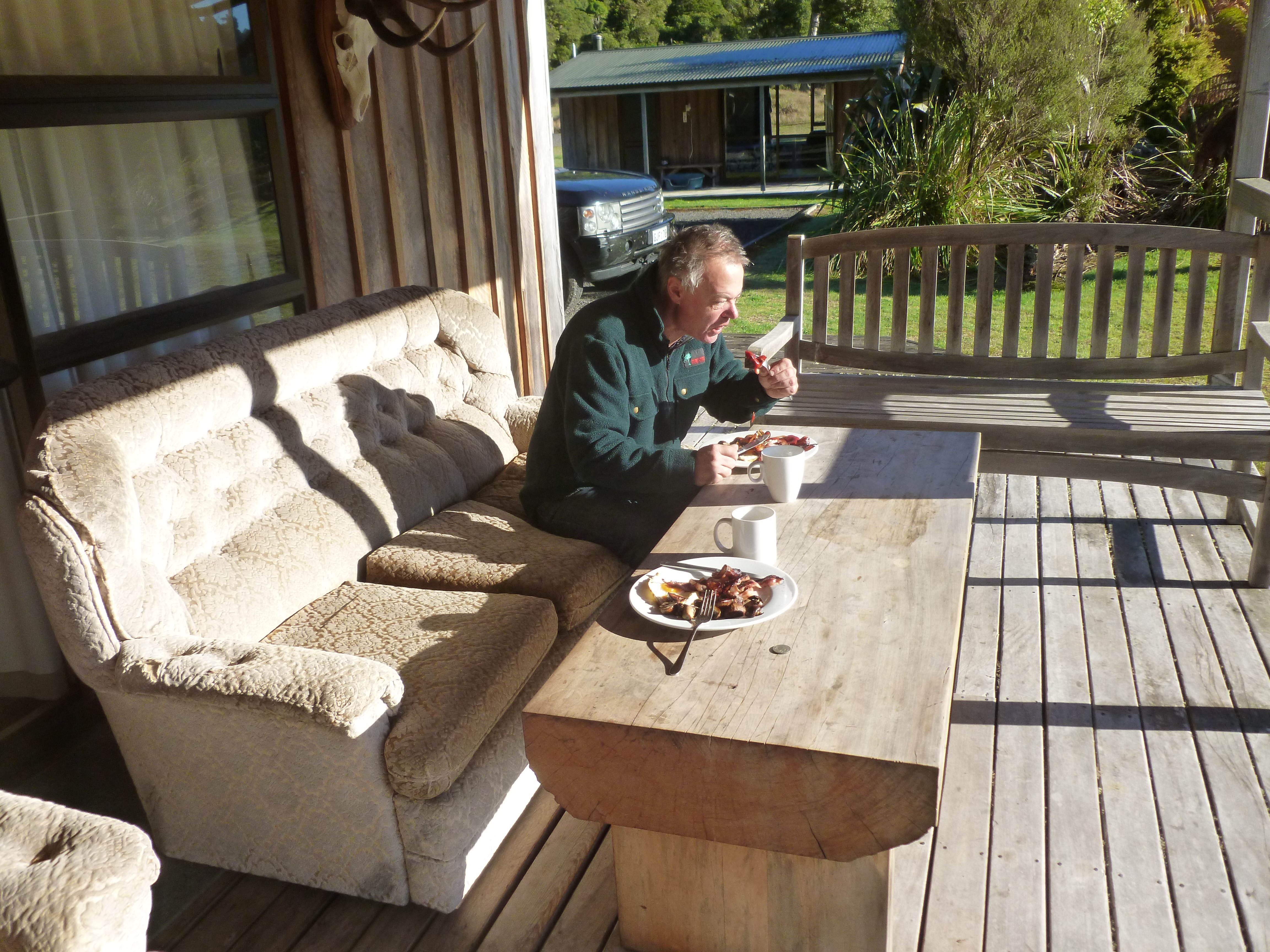 We took Mel’s rifles out to the range ( Yes they even have a sighting range ) so Mel could see if I was going to be able to hit a target with his 223 . He was sporting his backup 308. After surprising myself with just how light the trigger pressure was I managed to put five shots in reasonably close proximity on my target. WE headed off on a mid morning hunt – I startled a large stag which jumped clean into the air when I was a close as 10 metres to him – we were both very surprised. It ran off into bush and subsequently across a high slip. I heard the crash as Mel’s 308 went off as he took a shoot at the moving target. A miss – but we did get to sight him one last time as Mel anticipated his likely progress and we moved to an ambush position- another clear area and about 5 minutes later he appeared again but too short a time to get a bead on him.