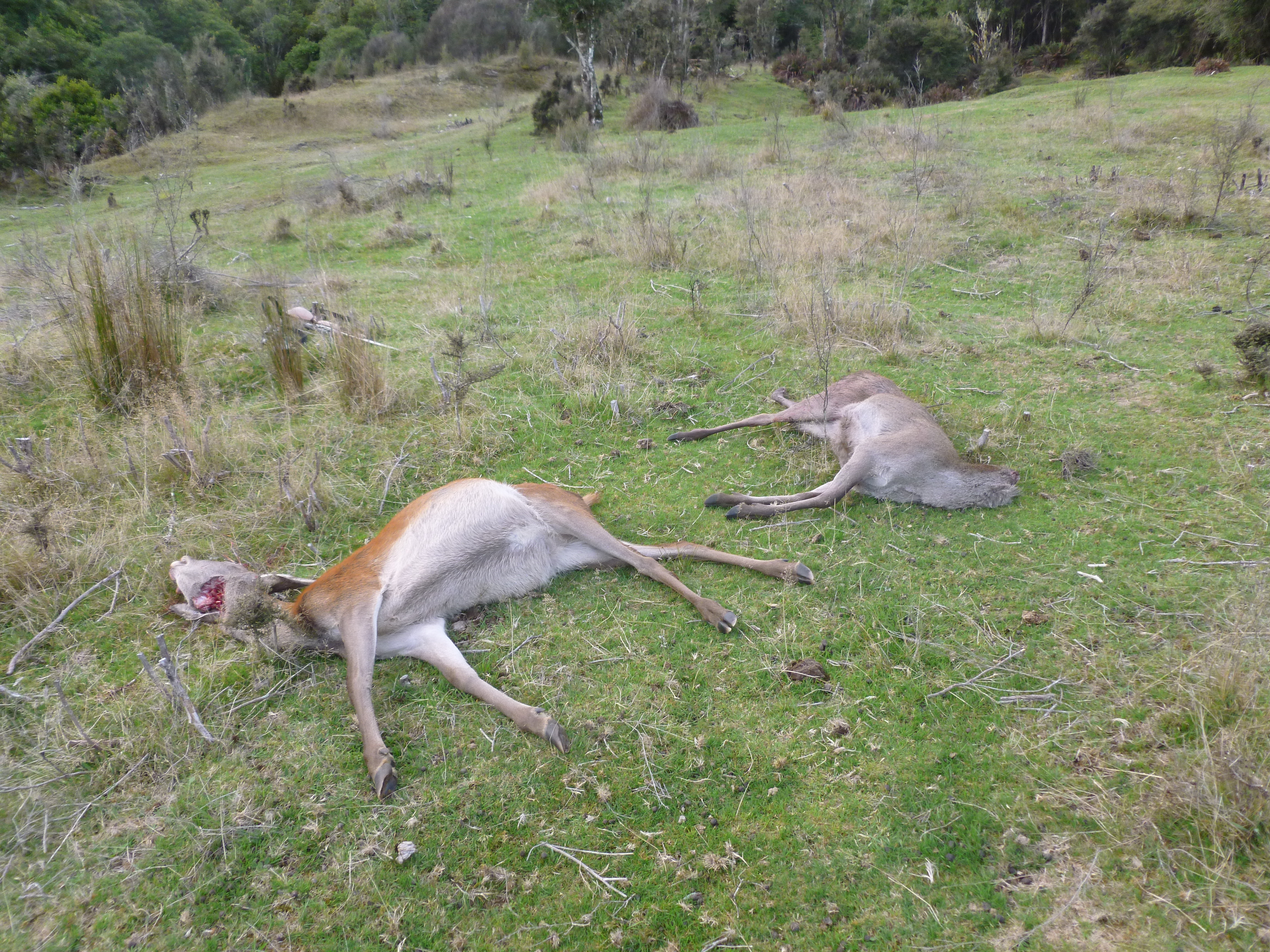 300 metres ( exactly – I checked with the range-rover odometer) I spotted our first deer – a spiker. I fumbled with the rifle trying to see him in the telescopic sight – too -too slow and he started moving off into bush. Mel moved back into the bush which flushed him back out and across the clearing. By that stage i was well ready – leaning against a tree to steady the shot and my racing heart. Boom – a quick reload and another shot. The deer crashed to the ground – probably the first shot – heat / lungs.