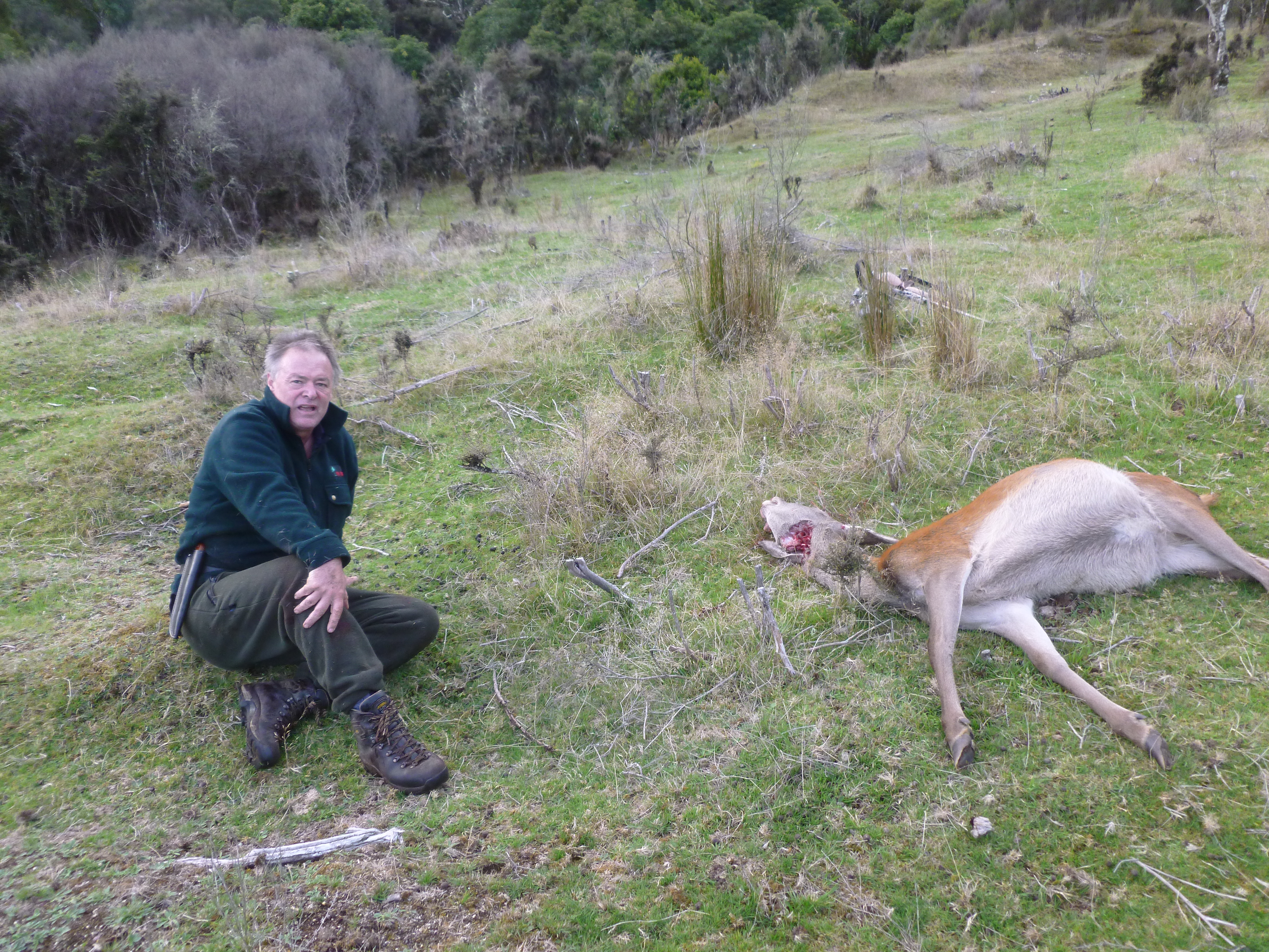 We stalked on for another hour or so – up a couple of short guts – but only another 1.1km on the track. Into a clearing Mel saw a hind grazing – he moved to get a better position – I waited rifle ready . The hind eventually seemed to spot me – and started to stare intently in my direction.I stood stock still – rifle ready – and waited for Mel to shoot. His shot- when it came was very effective as the hind dropped dead on the spot – barely moved. Meantime the scene changed with a further 4 or 5 yearlings springing up as if from nowhere. We fired at the moving targets and managed to hit another deer which crashed off down a steep bank into a small stream.We had a bit of work to carry the yearling up out of the creek but that was all.From there the range -rover!