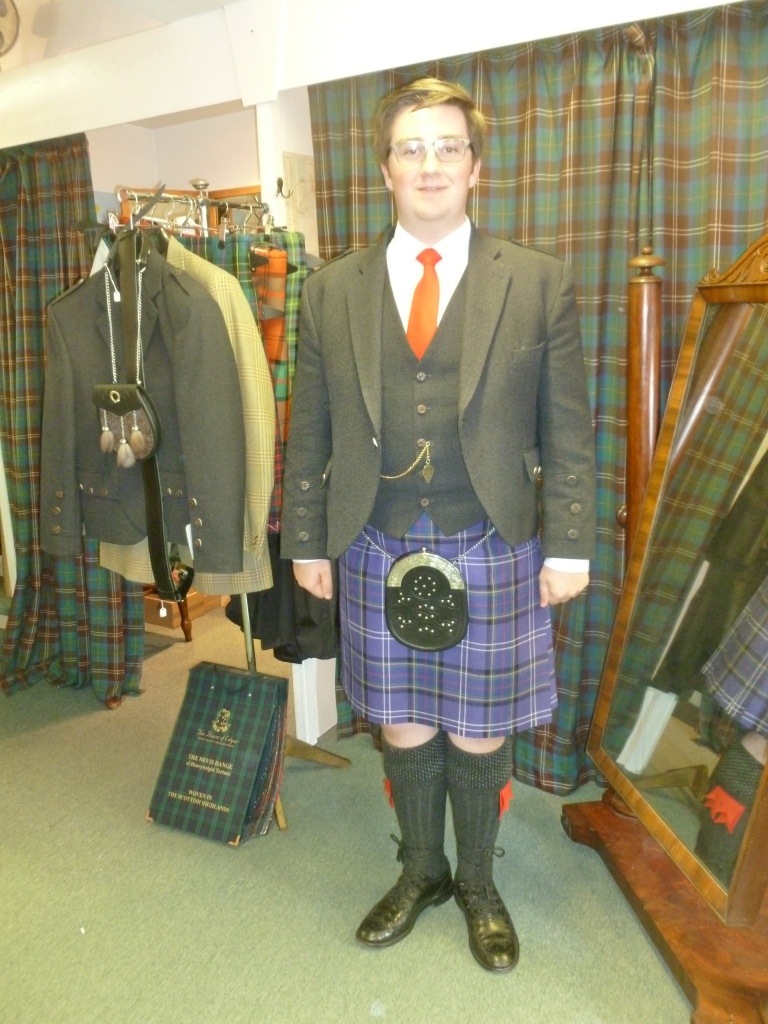 This photo is using a Chisholm hunting tartan – trying for size – these guys are the experts and the fitting and measuring required to get the correct fit is essential to get a kilt that will be pleasure to wear –took about 90 minutes. Those close to me appreciate that I actually have some affinity to wearing ” lava lava like ” type garments.