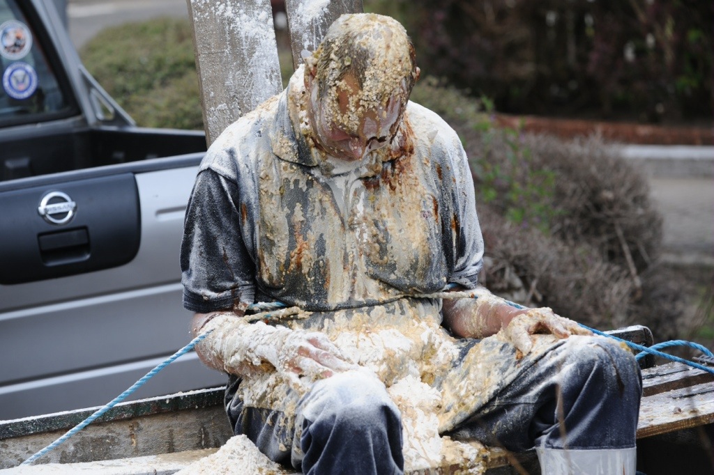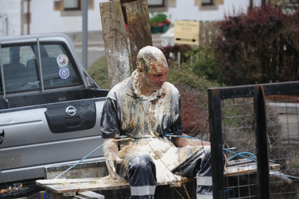 We chanced upon this ” BLACKENING” a local tradition that may explain why many Scotsman may elect to elope with their lovers rather than submit to this barbaric tradition. All the villagers collect buckets of filth – no holds bared – and this sorry looking lad has to endure all of his friends , and enemies throwing disgusting concoctions of craps over him.