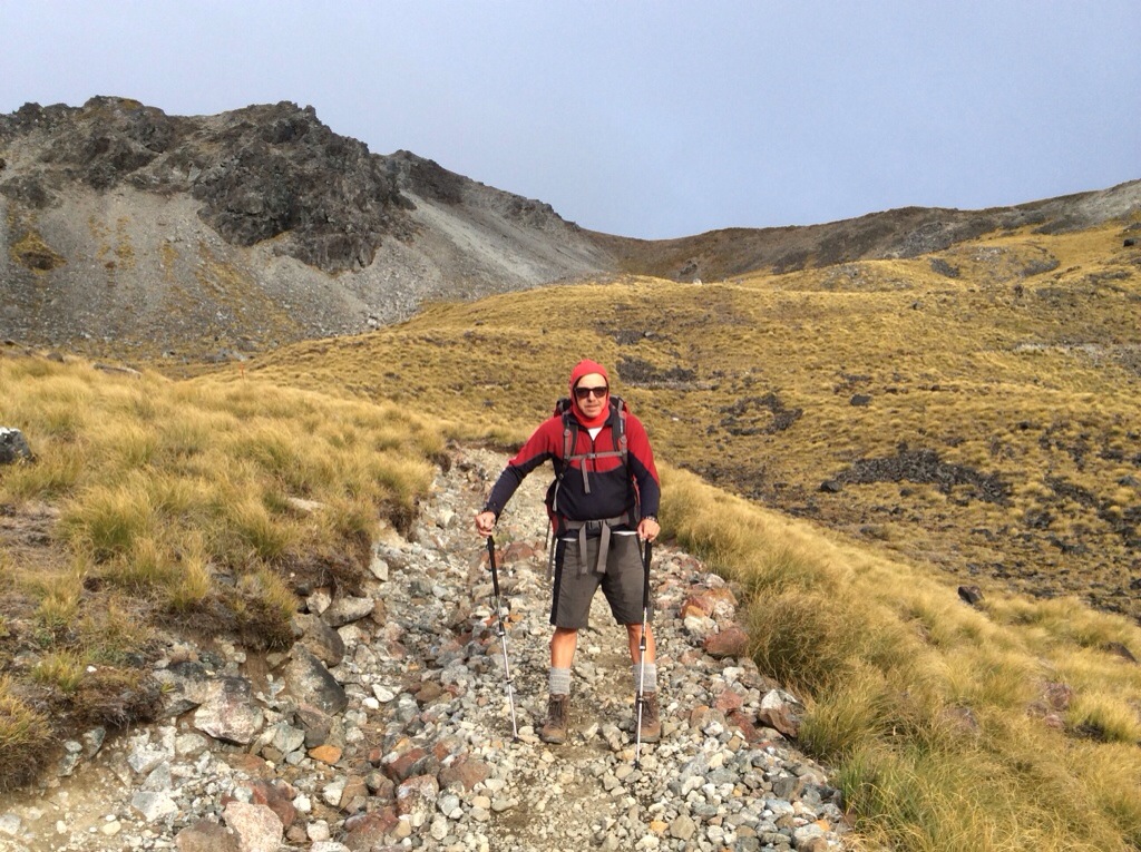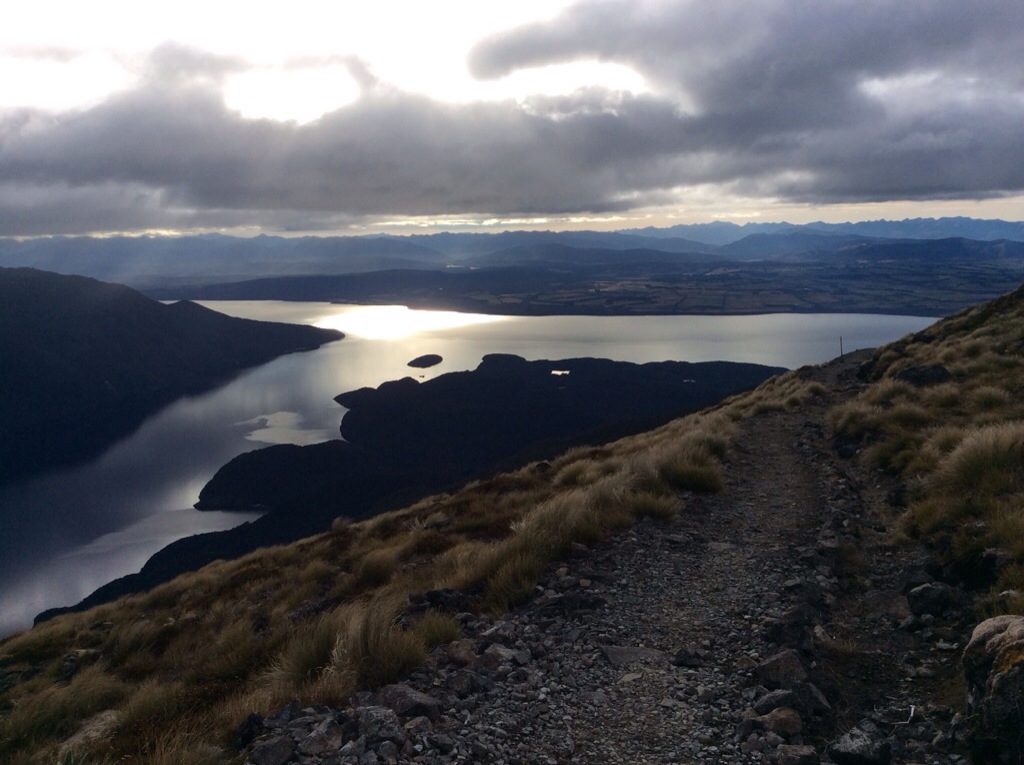 The walk begins on the lake frontage but soon we were committed to the climb – a steady 800 metre winding up through dense podocarp forest . At the altitude of about 1000 metres we finally emerged into the tussock country and the effort is well rewarded with many great views of the surrounding country. We made steady if painful progress – the weight of all the food we had ( foolishly )elected to carry starting to make me feel like a beast of burden. The thought of eating big meals is appealing as less burden tomorrow . By the last day it will be bliss.