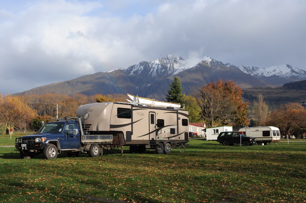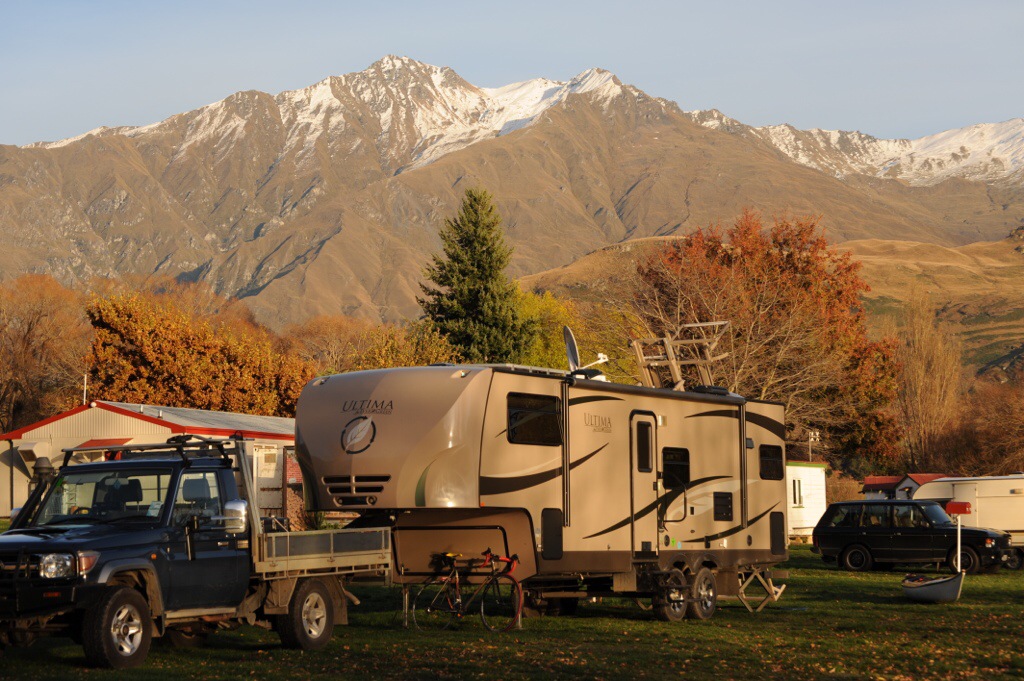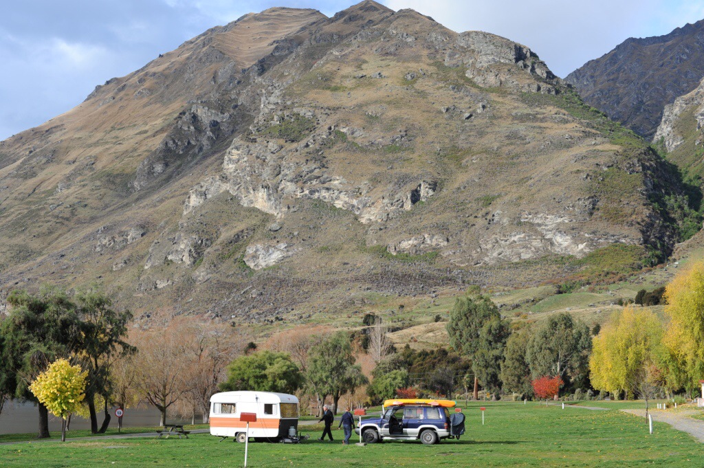 Megan and Phil Prendergast arrived back in Queenstown from Kerikeri and set off for the campsite at Glendhu Bay as their destination for another week in their caravan. They have been holidaying with their caravan in the South Island in segments interspersed with flights back home to take care of Phil’s computer business. We both arrived within seconds of each other to this extensive campsite – stunning backdrop – but virtually deserted save one other caravan. We have it all to ourselves.