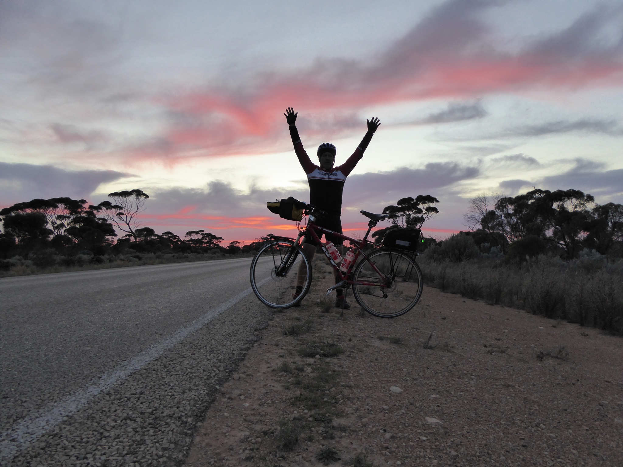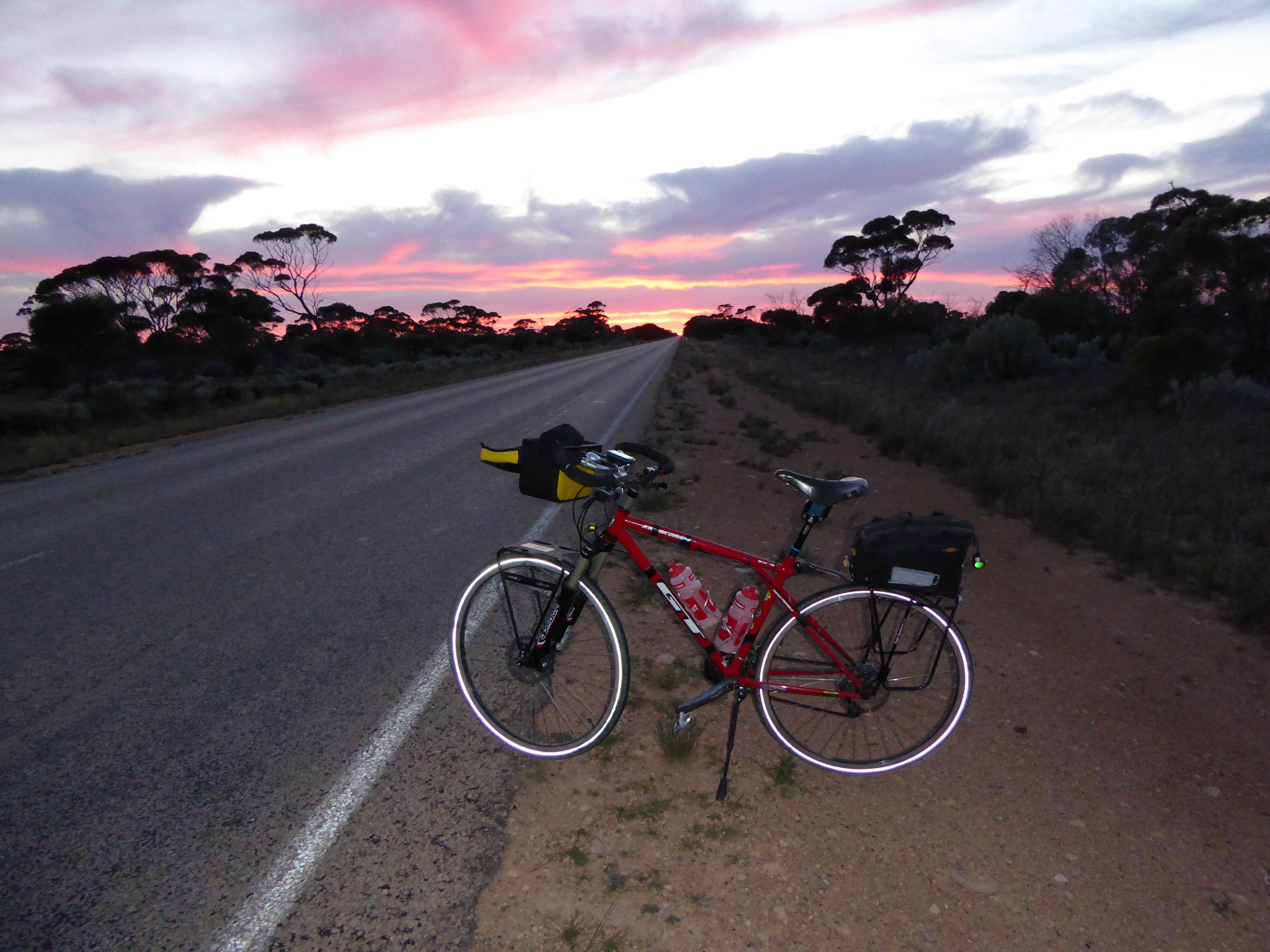 Heading off into a tunnel of darkness was a bit spooky – a star studded horizon . The lights on the bike worked very well and I made great progress in very still predawn conditions. Dawn arrived at about the 90 km mark. I celebrated the 60 km , 100 km and 150 km marks with chocolate bars – great incentive as the Kms ticked by.The last 50 Kms was character building with the promised westerly slowing the bike down considerably.