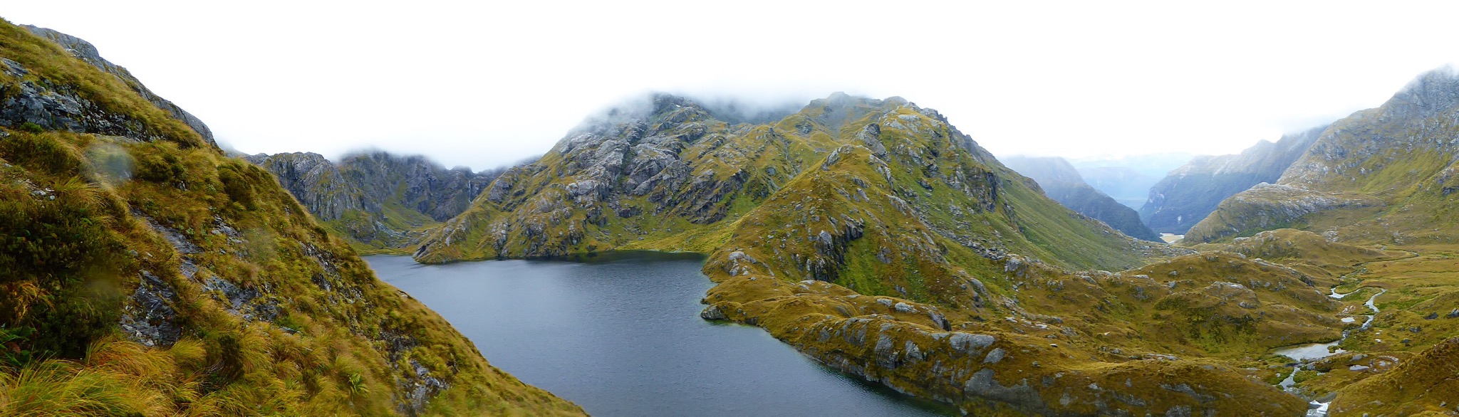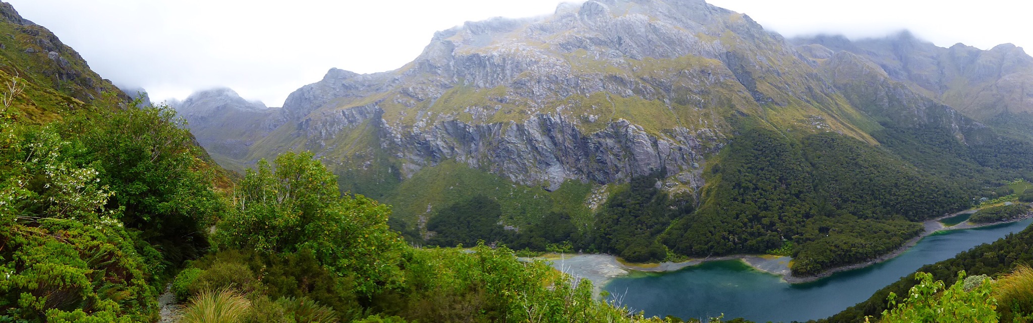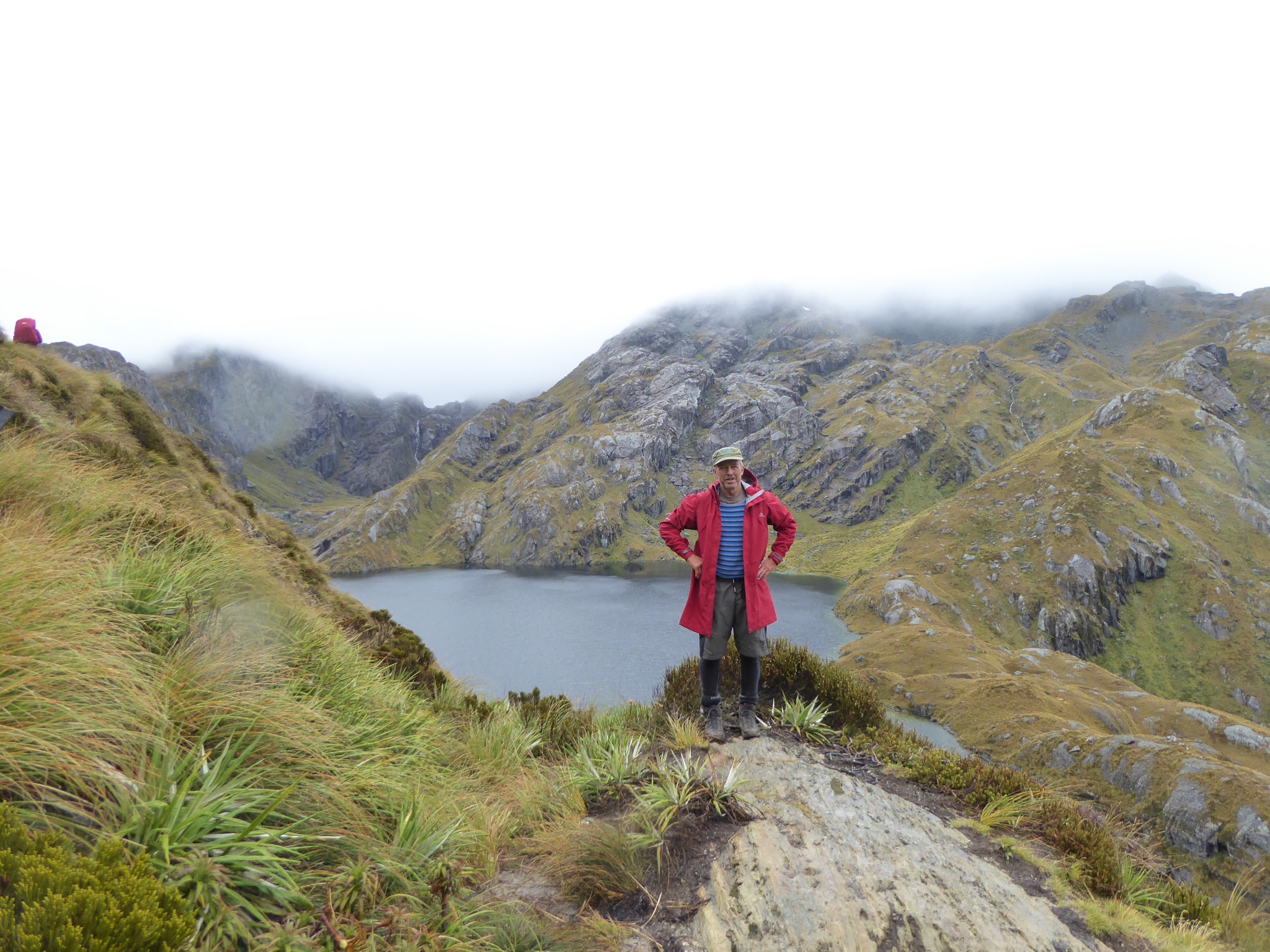 The forecast for the our walk over the Harris Saddle was poor – and indeed we did have cloud that obscured the other side of the Hollyford valley. We put the raincoats on due to some light misty rain but we did not get the heavy rain we had expected. The views from the top of the Harris saddle looking down into Lake Harris were still pretty cool.
