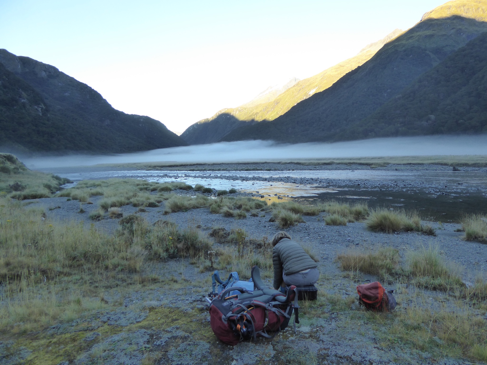Surprised just how popular this special place is , the hut has been pretty full and one night there were many folk sleeping on the kitchen floor as beds ran out. A noisy group of hunters arrived by helicopter and proceeded to get themselves legless with lots of hard liquor. A bit like first night school camp kids – they had a real bad first night but last night they were pretty much all tired out and ready for bed at the same time as all the trampers. Sleeping in these dorm style huts like sardines is not actually all that great – the burps , farts and endless synchronized snoring can make sleep elusive – I hauled my mattress out into the kitchen last night to enjoy and relative cool and peace and quiet and uninterrupted sleep. Entering the dorm this morning the atmosphere was unpleasant , smelled worse than a Greek wrestlers jockstrap π±