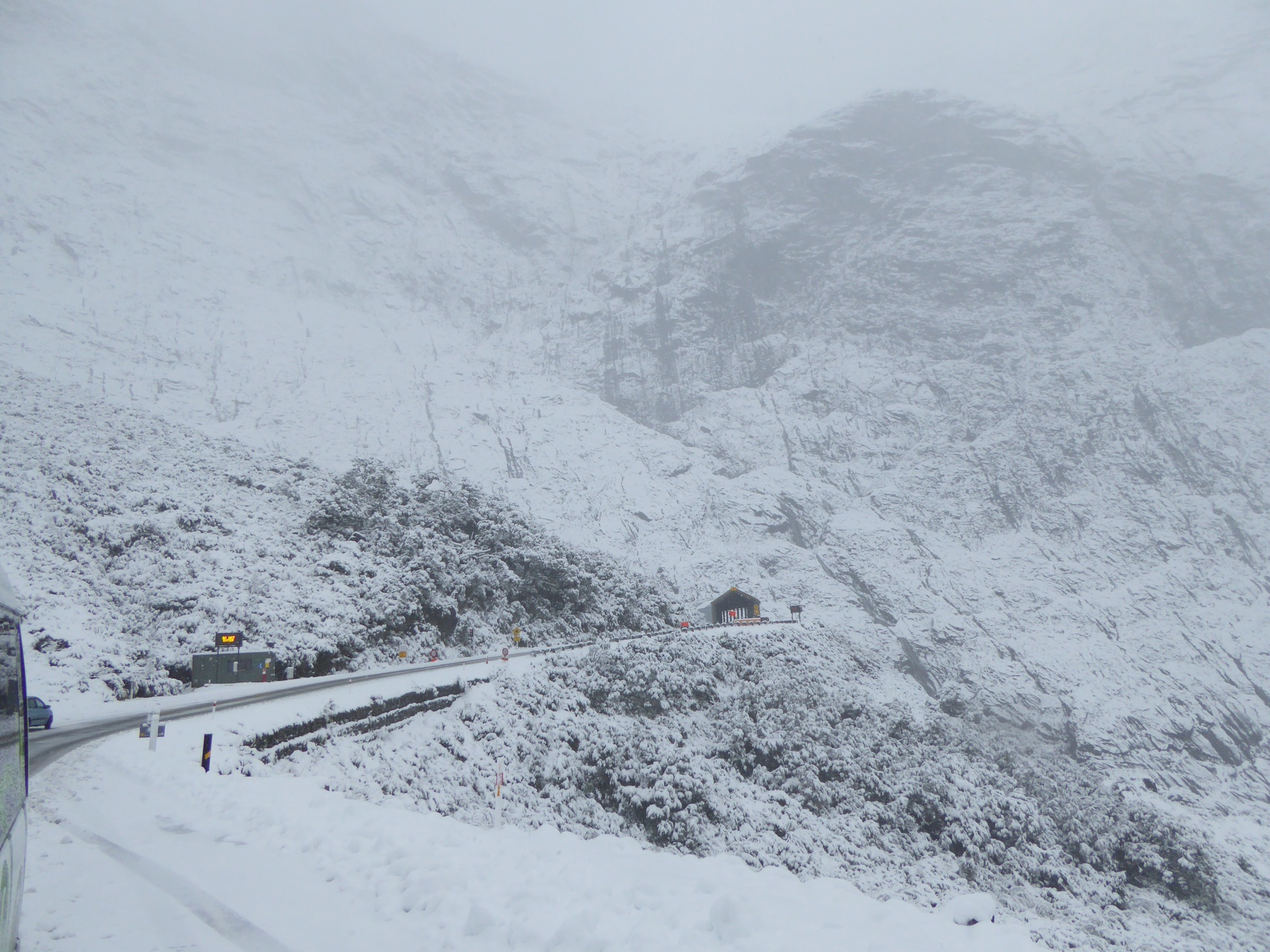 Close to the Milford tunnel we started to have traction problems and the driver had us out helping him in the tricky job of fitting awkward duel rear chains. We waited for quite some time due to a bus and some cars that were blocking the road on the Milford side.