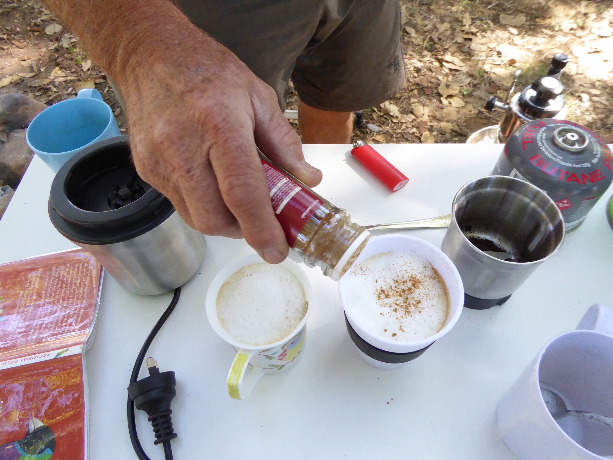 We have taken our morning coffee to a new , even more illustrious level with the purchase of a neat little sunbeam coffee grinder and the purchase of a big 1 kg bag of the very finest quality beans from Kununurra . We need to run the generator to do the grind but it only takes a moment of two . Have been refining the use of our cappuccino maker – and the results get better with experience – note the lovely cremma