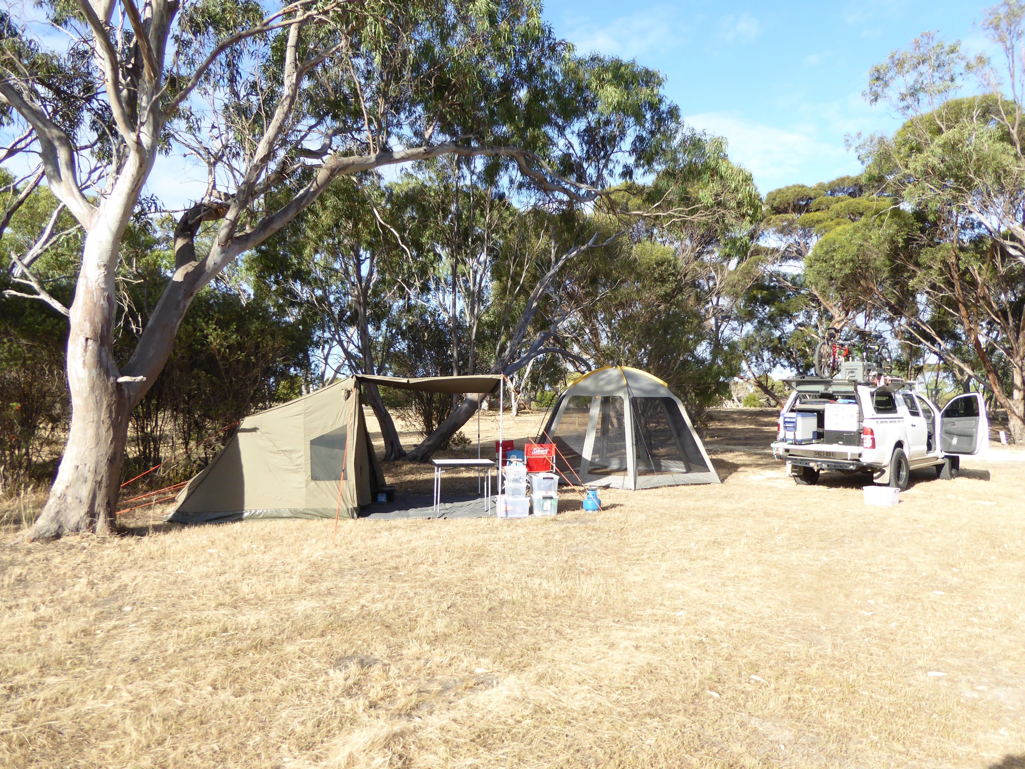 Our first campsite is set up at Emu Bay — some rather odd locals hereabouts and the camp is some distance from the beach. It is extremely dry and locals warn of flies in plague proportions in some parts of the island when it is hot. We are due for hot days. Decided to erect our ” fly retreat Guzimbo ” — those little Aussy bastards will find it difficult overwhelming us.