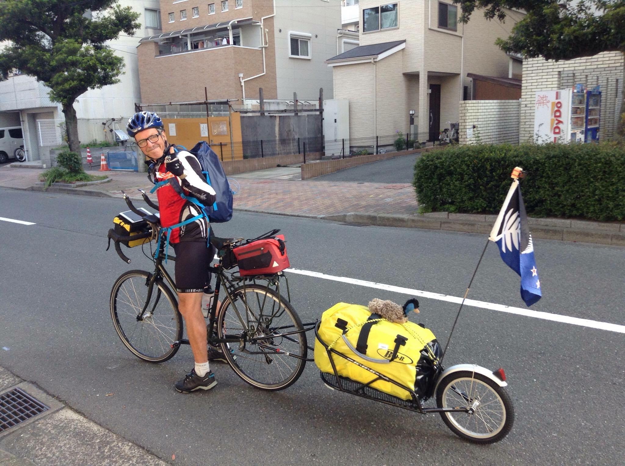 Landed at Fukuoka airport and spent a good hour or more meticulously reassembling all the bits of the bike and trailer. Found a quiet corner of the airport for the job. All came together with no problems or extra parts. Kind workers nearby happily took all the cardboard boxes away. Had an address for a family who are members of ” warm showers ” group – likeminded folk who cycle distance and offer hoisting to fellow cyclists. Noriaki and his wife Etsuko and daughter Ririko hosted me with huge generosity and kindness . On leaving I packed away a big stack of snacks and a nicely gift wrapped ” bento box ” ( lunch ) made that morning by Etsuko. Was sad to say goodby.