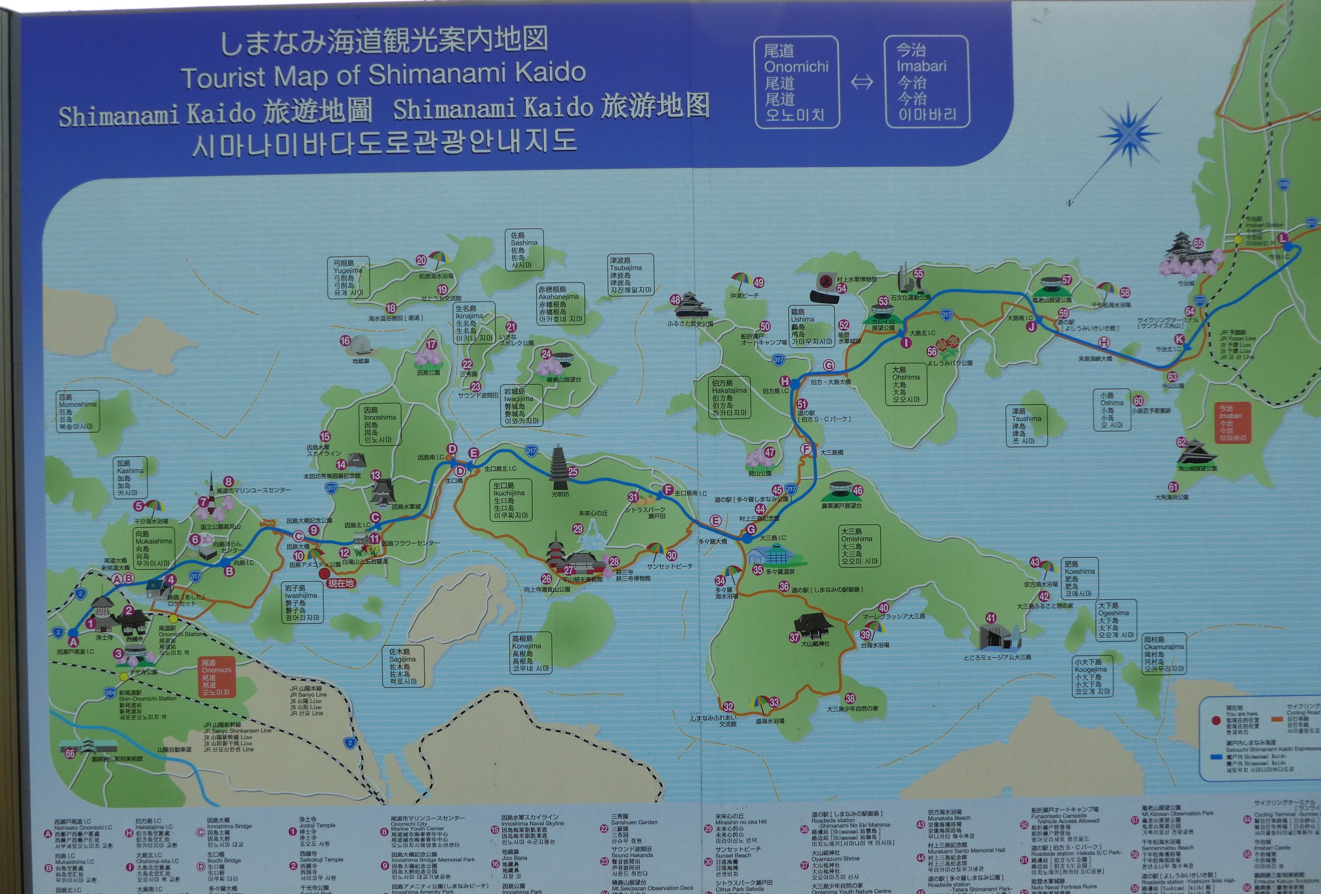 Often one thinks of Japan as having three main island , Kyuhu , Honshu and Hokkiado , but there is another significant sized island across the inland sea from Honshu , called Shikoku province. Japan had developed an amazing one day ride of about 70 kms that island hops across by way of these HUGE suspension bridges.