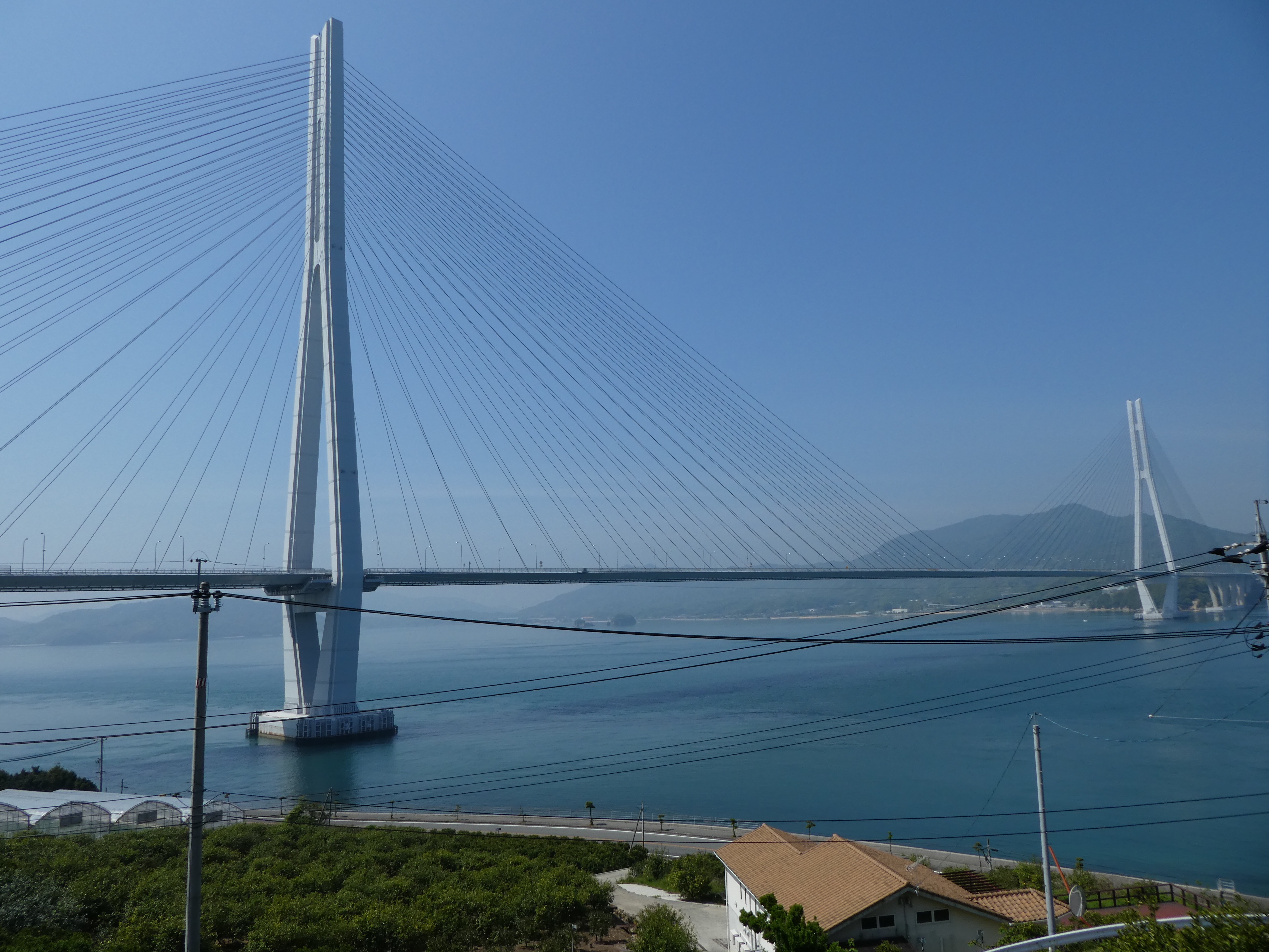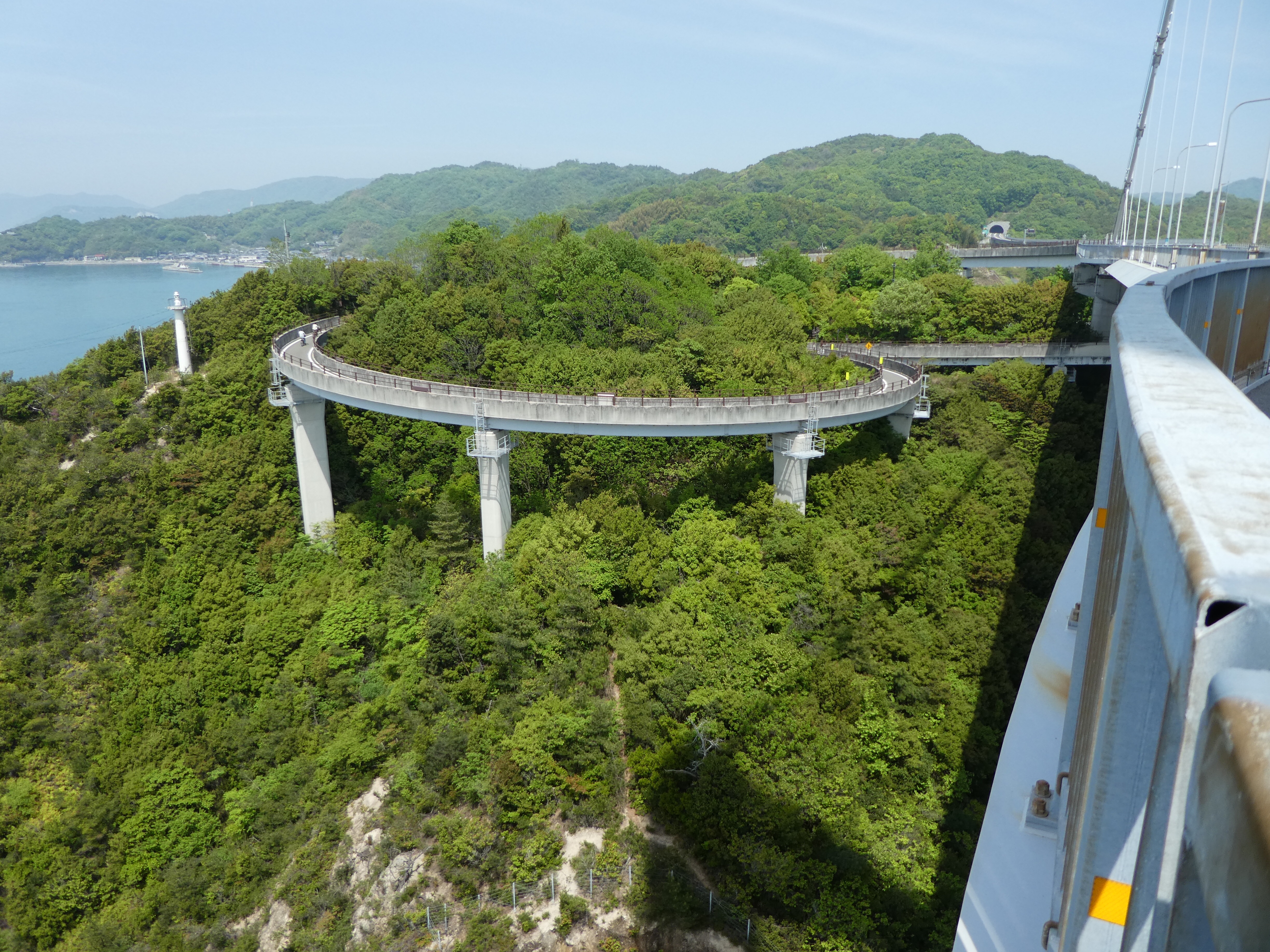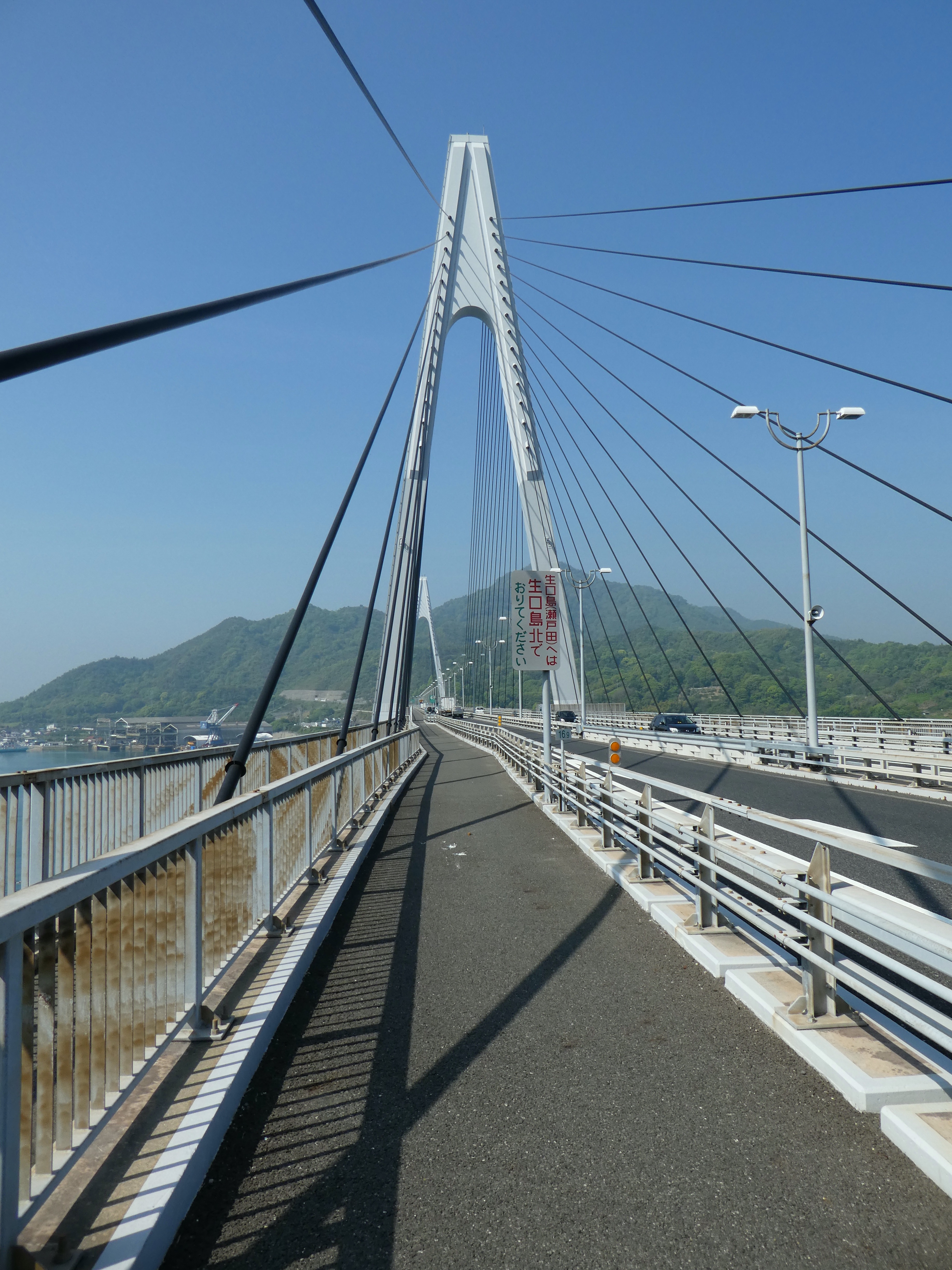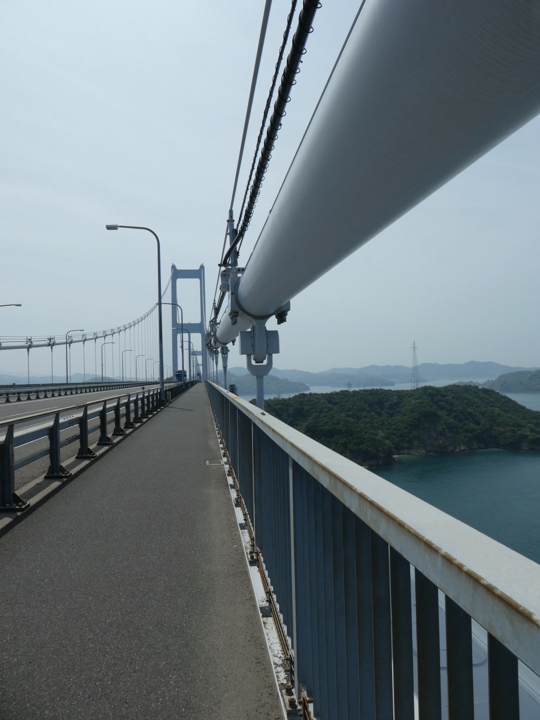 Japanese cyclists are very justifiably proud of this special cycle way that makes it possible to cycle from Honshu to the 4 th island in Japan , Shikoku. The route bunny hops from island to island over a series of huge suspension bridges. Designated cycle path ways have been built ( huge expense I guess ) so it is safe . At each bridge end and or approach special pathways have been set up to get up to the deck level — up to 70 metres above sea level.