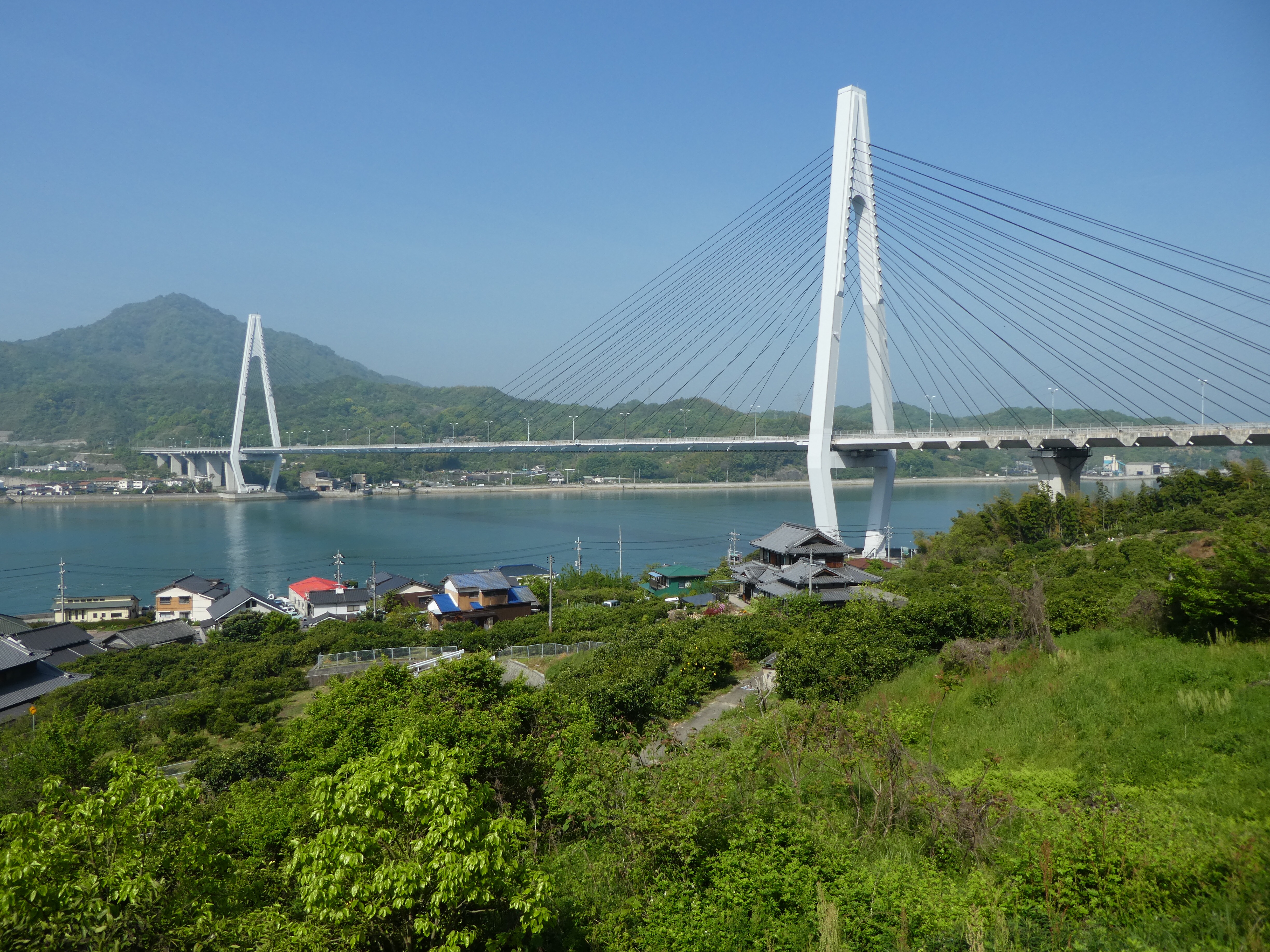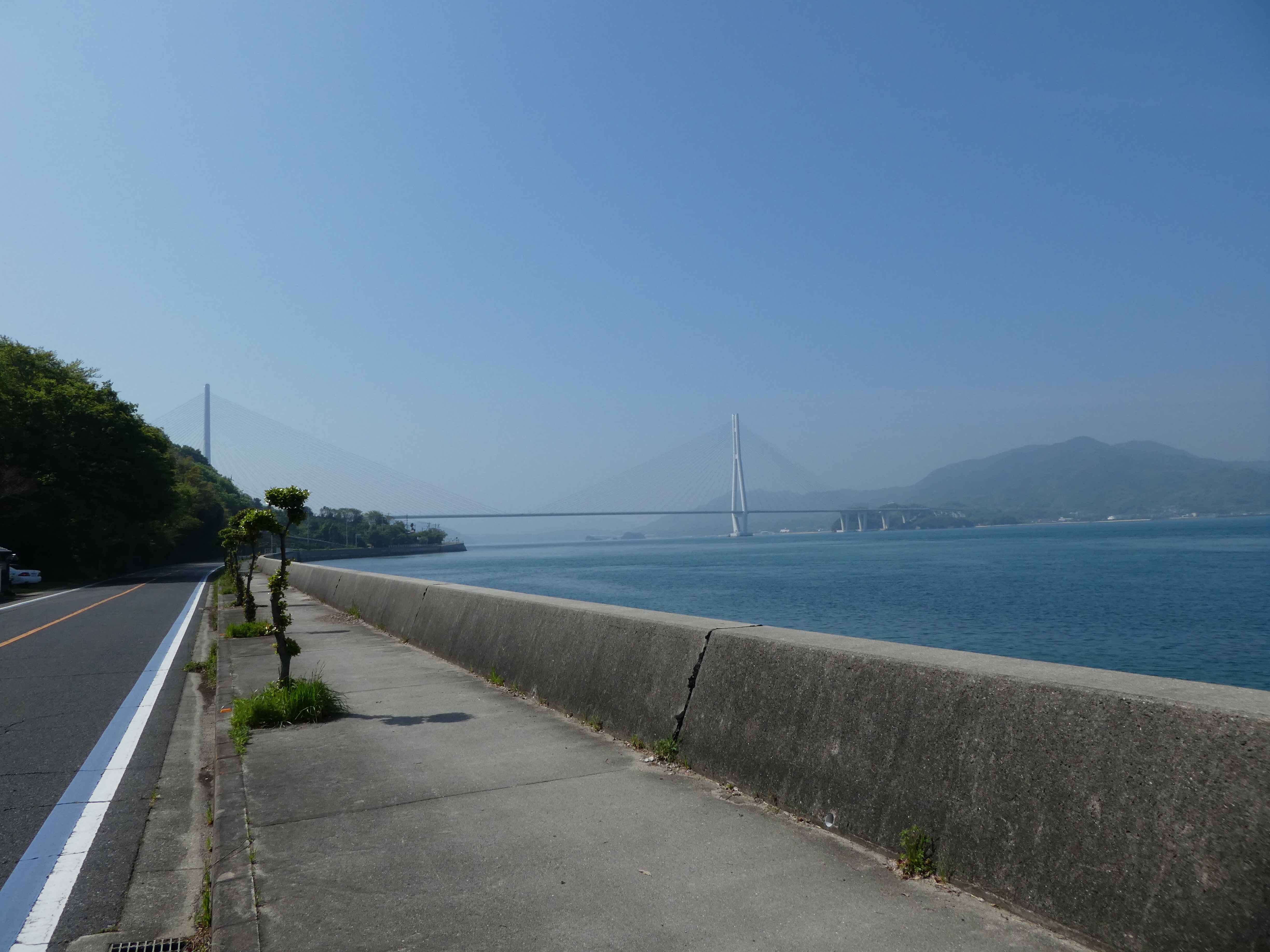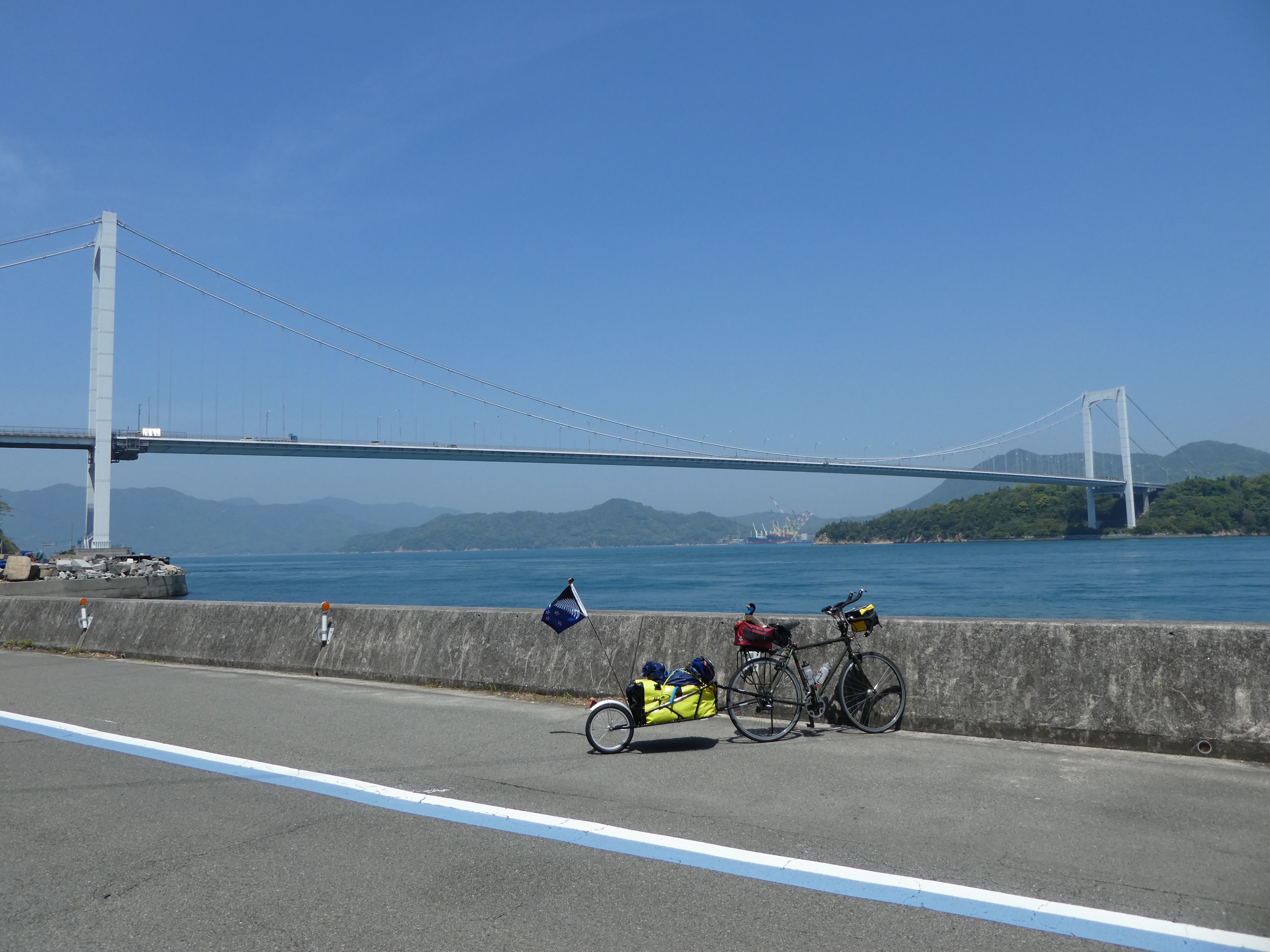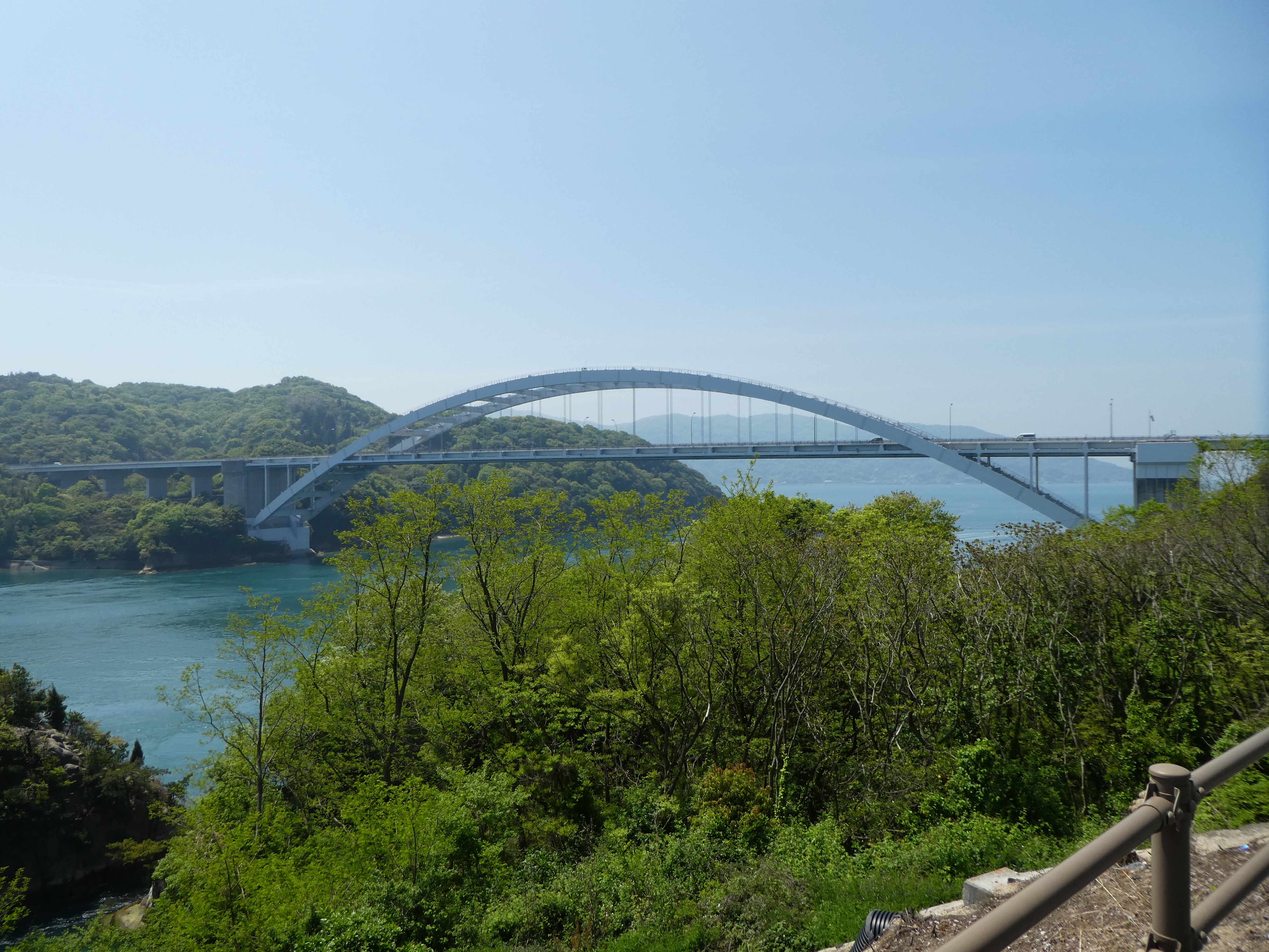 Japanese cyclists are very justifiably proud of this special cycle way that makes it possible to cycle from Honshu to the 4 th island in Japan , Shikoku. The route bunny hops from island to island over a series of huge suspension bridges. Designated cycle path ways have been built ( huge expense I guess ) so it is safe . At each bridge end and or approach special pathways have been set up to get up to the deck level — up to 70 metres above sea level.