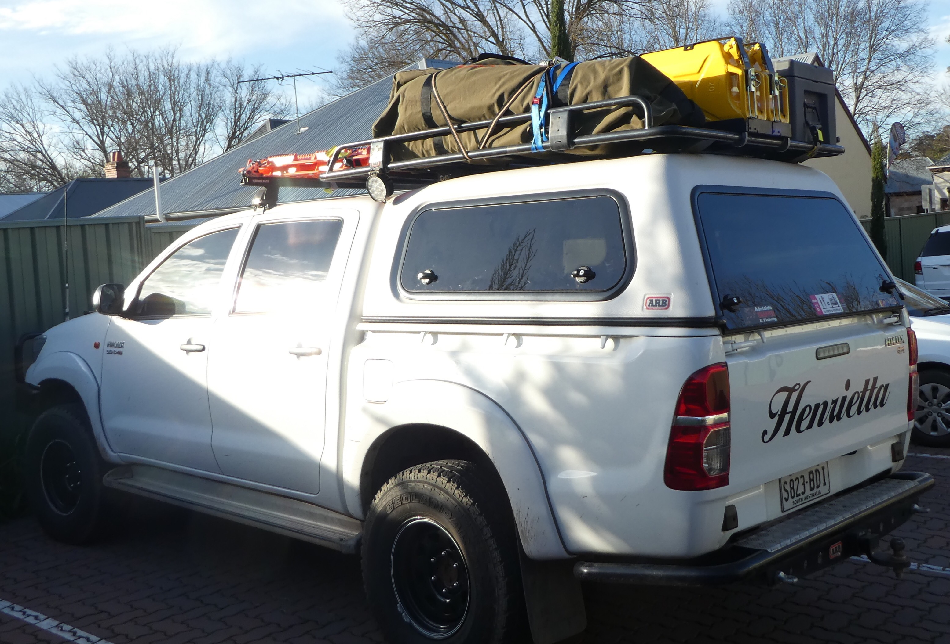 My partner in this adventure , swagman Paul Sutton , has just finished off securing his last , most important piece of kit . He has this most impressive swag , a sort of tent swag. Paul manufactured some neat hardware to secure the jerry cans to the roof rack for the extra 40 liters of fuel we estimate we will require . He is a consummate engineer held in high repute by those lucky enough to know him and Henrietta has been given a comprehensive survey by Paul to ensure she it fit for the demands ahead. We have a bunch of extra spares , a neat sarca ground anchor for winching ourselves out of the shit and some important kit that allows us to repair tyres in the outback ( a beadbreaker)