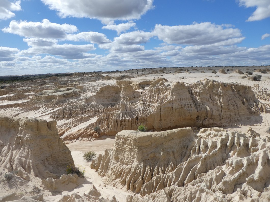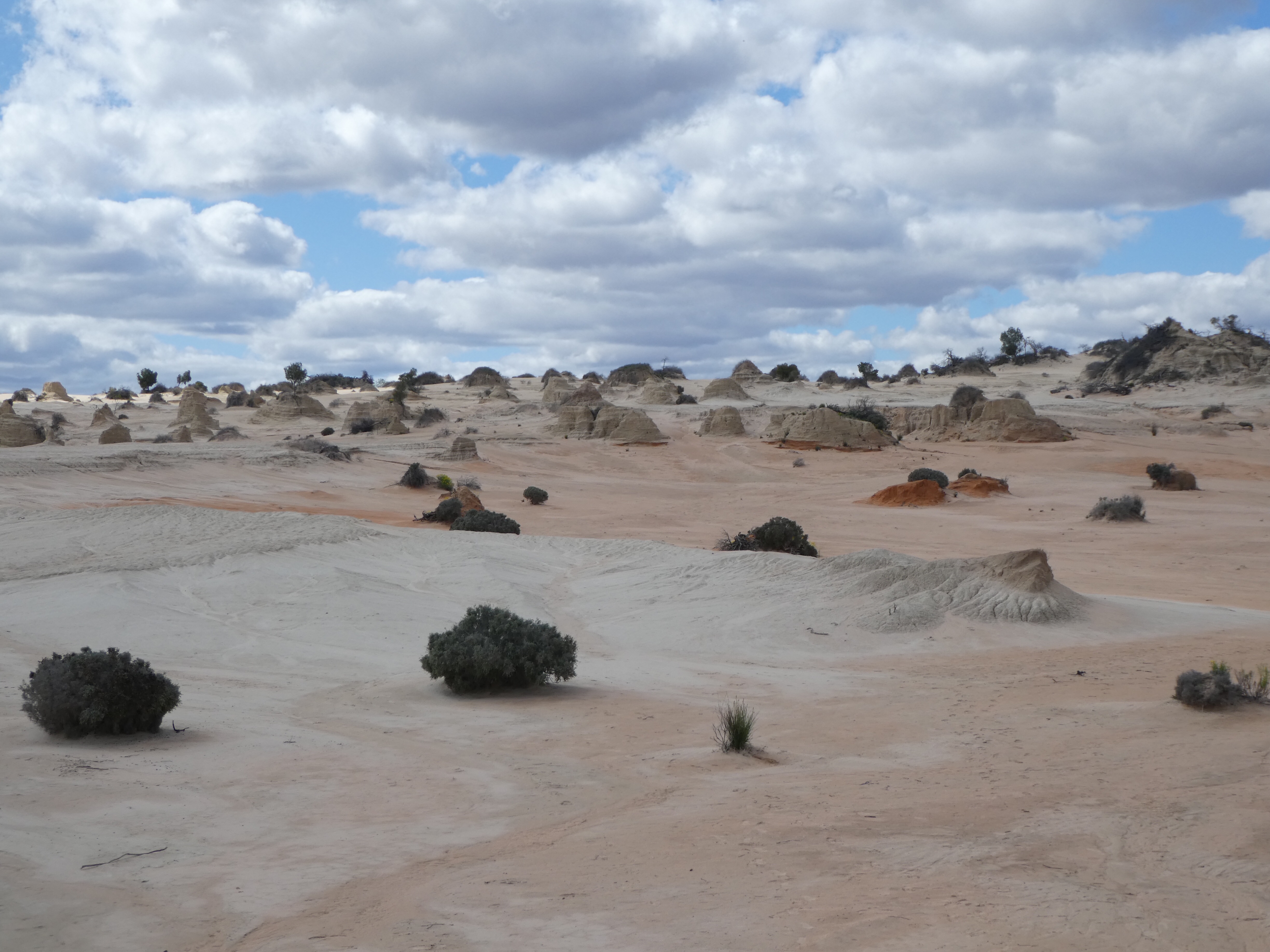 Lake Mungo is one of a number of one dried up lake beds in the Willandra area. Mungo dried up approx. 18,000 – 20,000 years ago at the end of the last major glacial age . At that time Australia had glaciers up in the snowy mountains area that feed the lake systems. The archaeological evidence proves that this area used to be a thriving green zone teeming with life . The lakes were full of fish and birds and other interesting Australian Megafauna. Possibly this indicates that aboriginal peoples first settled the inland areas of AU when the climate was not arid like today , but they stayed on and adapted to the huge climate change as AU became arid- desert like after the end of the last glacial period.