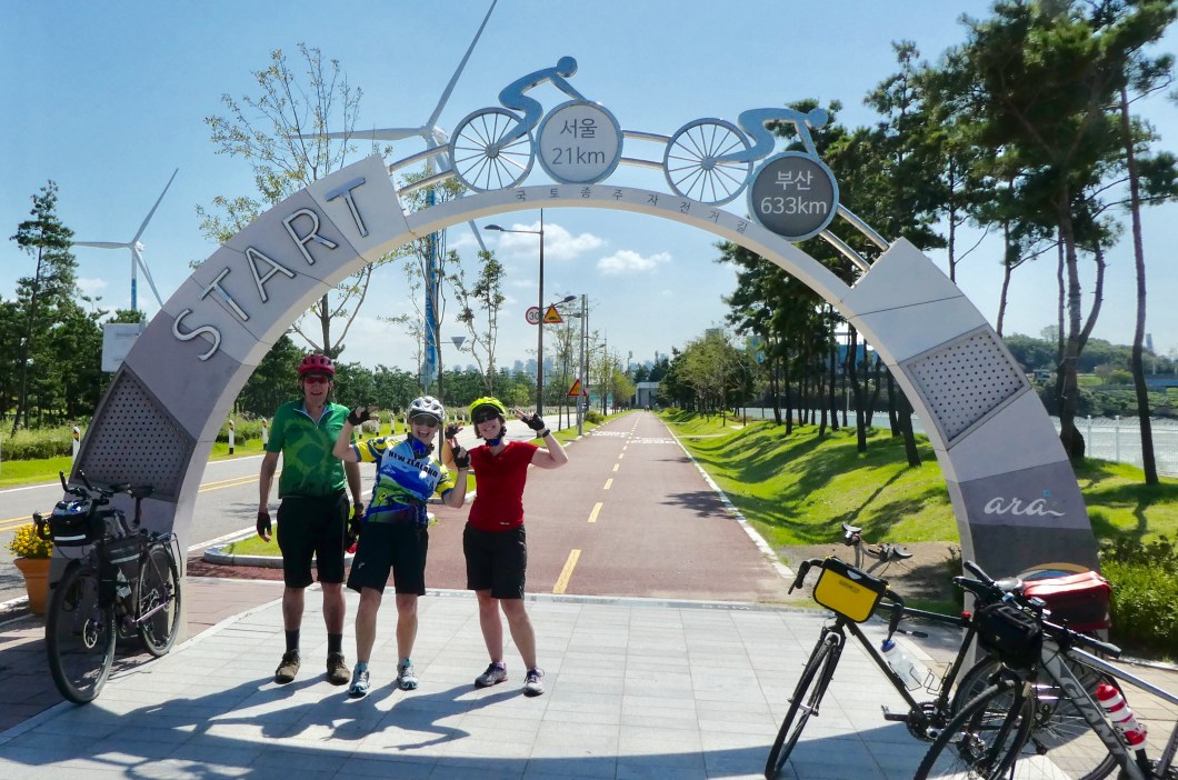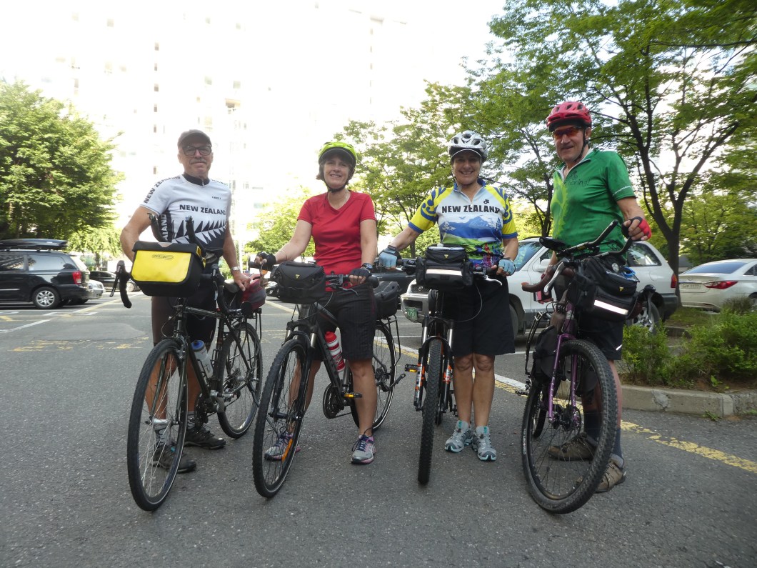 We flew in from Frankfurt , Rose N Carl from NZ and both landed in Seoul on Saturday. We both arrived at the ” Homestay ” accomodation called Pineville House , chosen for its close proximity to the Han river and the cycle trail. We all looked in pretty good shape , all things considered and both rhapsodising about horizontal benefits of Korean Air prestige class.