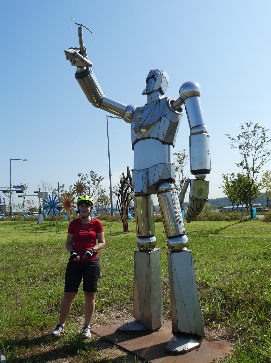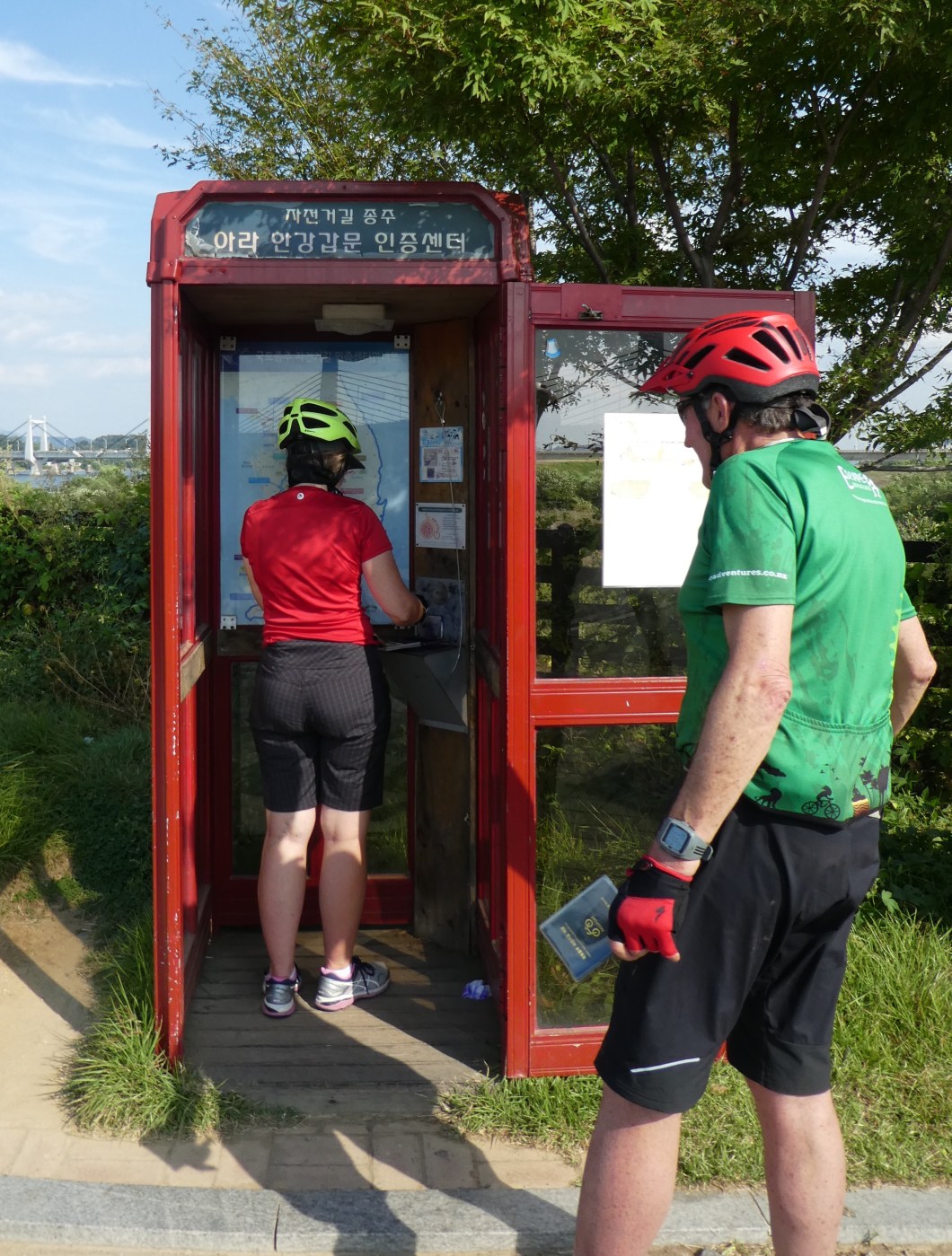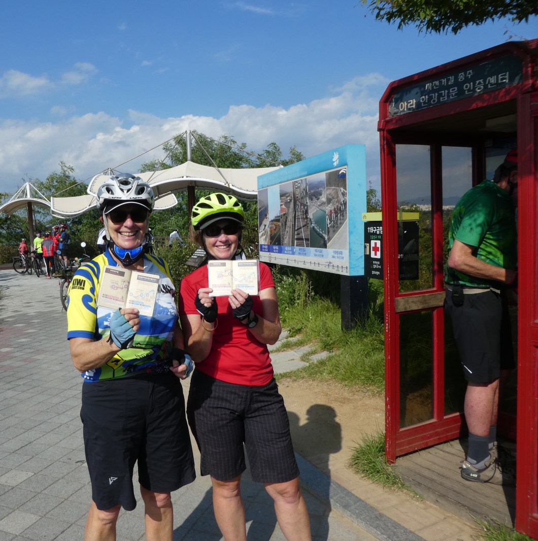 You can buy lots of cycling paraphernalia at roadside cafes and cycle repair stations , and the cycle trail has a steady stream of locals out cycling. We finally got a serious problem fixed on Barbs bike that had a failing rear hydraulic break. A complete new unit , callipers and handbreak lever was replaced in an outside repair station all for 50,000 WON ( about $50 nz dollars )