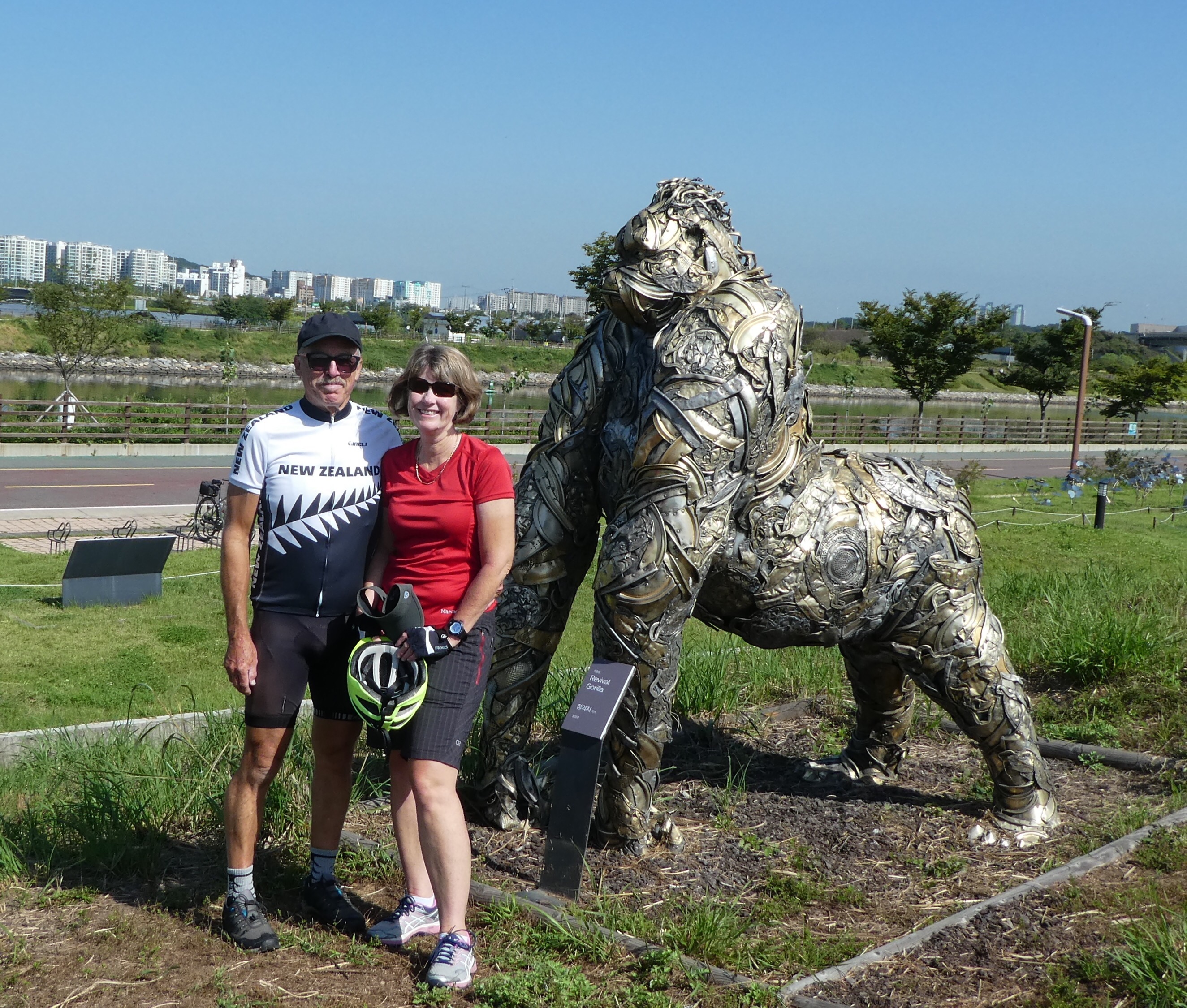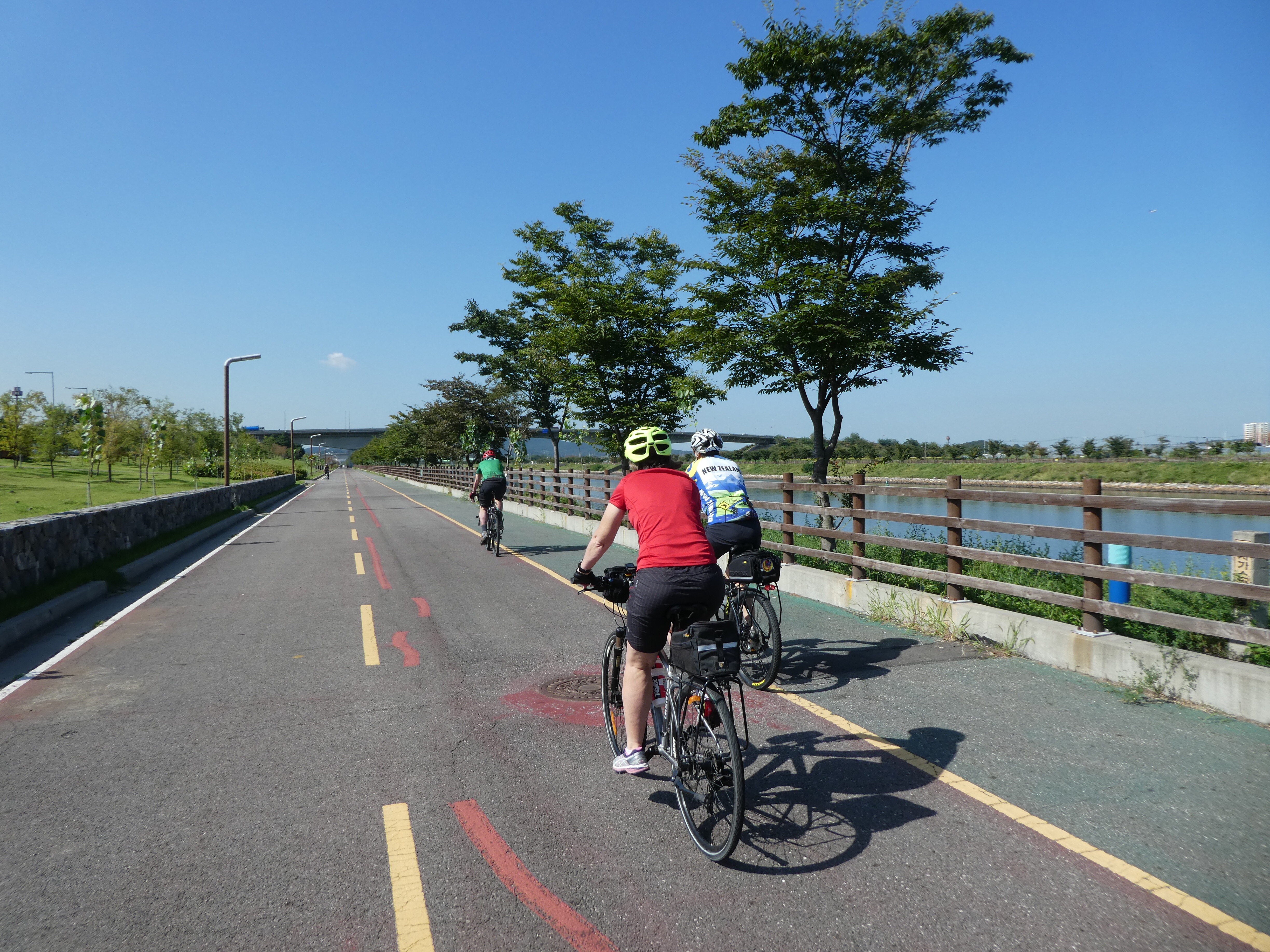 We flew in from Frankfurt , Rose N Carl from NZ and both landed in Seoul on Saturday. We both arrived at the ” Homestay ” accomodation called Pineville House , chosen for its close proximity to the Han river and the cycle trail. We all looked in pretty good shape , all things considered and both rhapsodising about horizontal benefits of Korean Air prestige class.