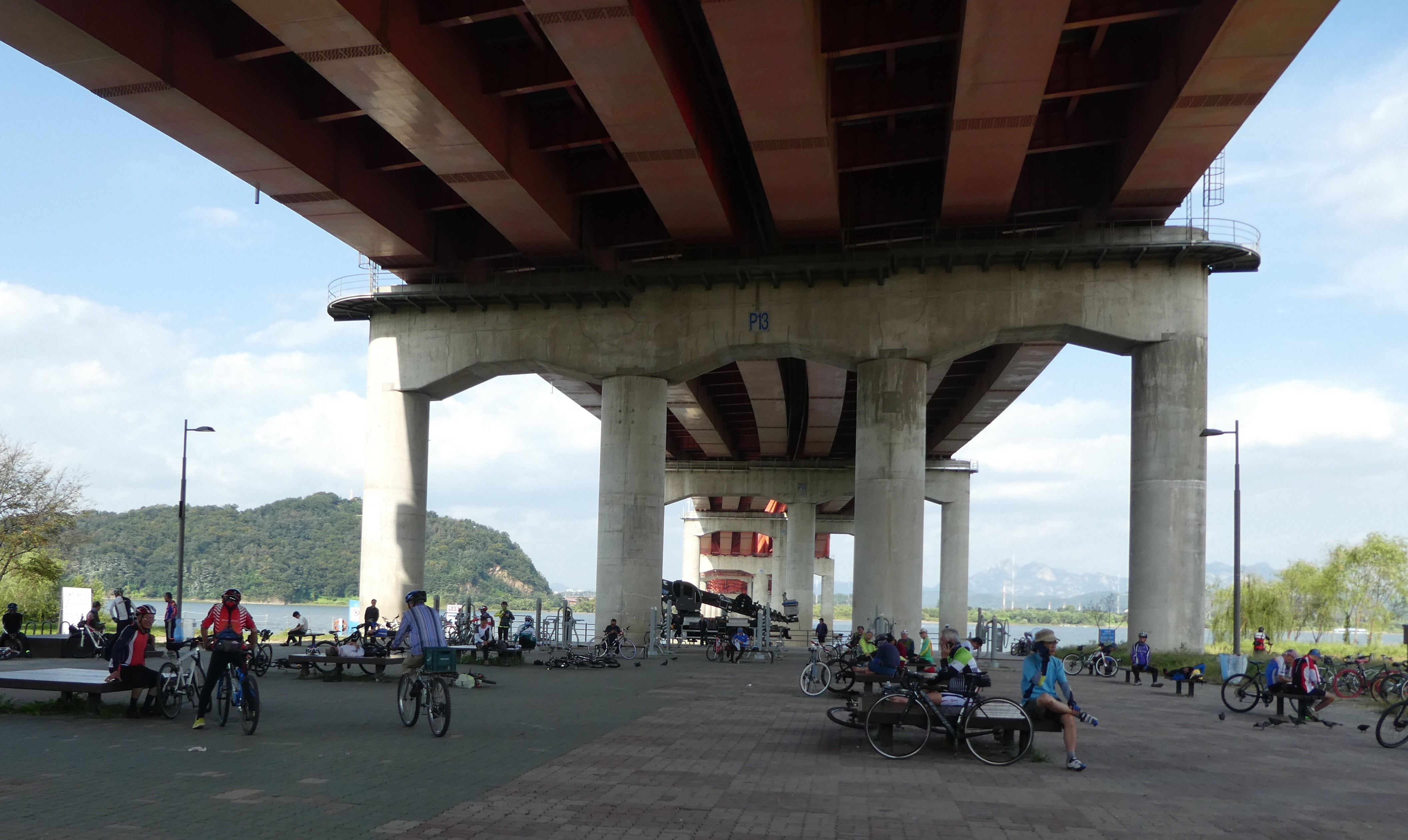 Lots of bridges here on the Han river , and convenient shady spots for cyclists to rest for a while .
