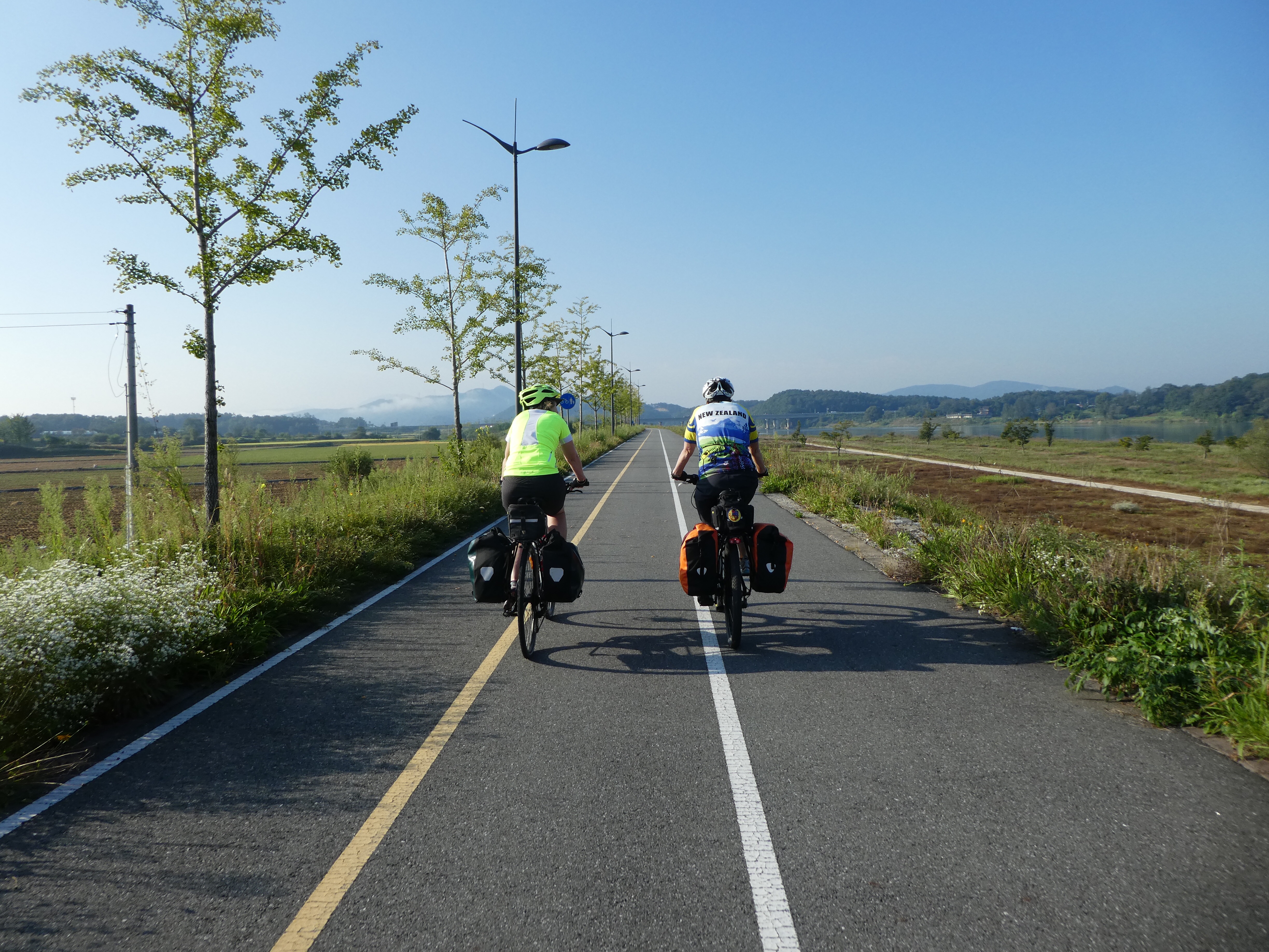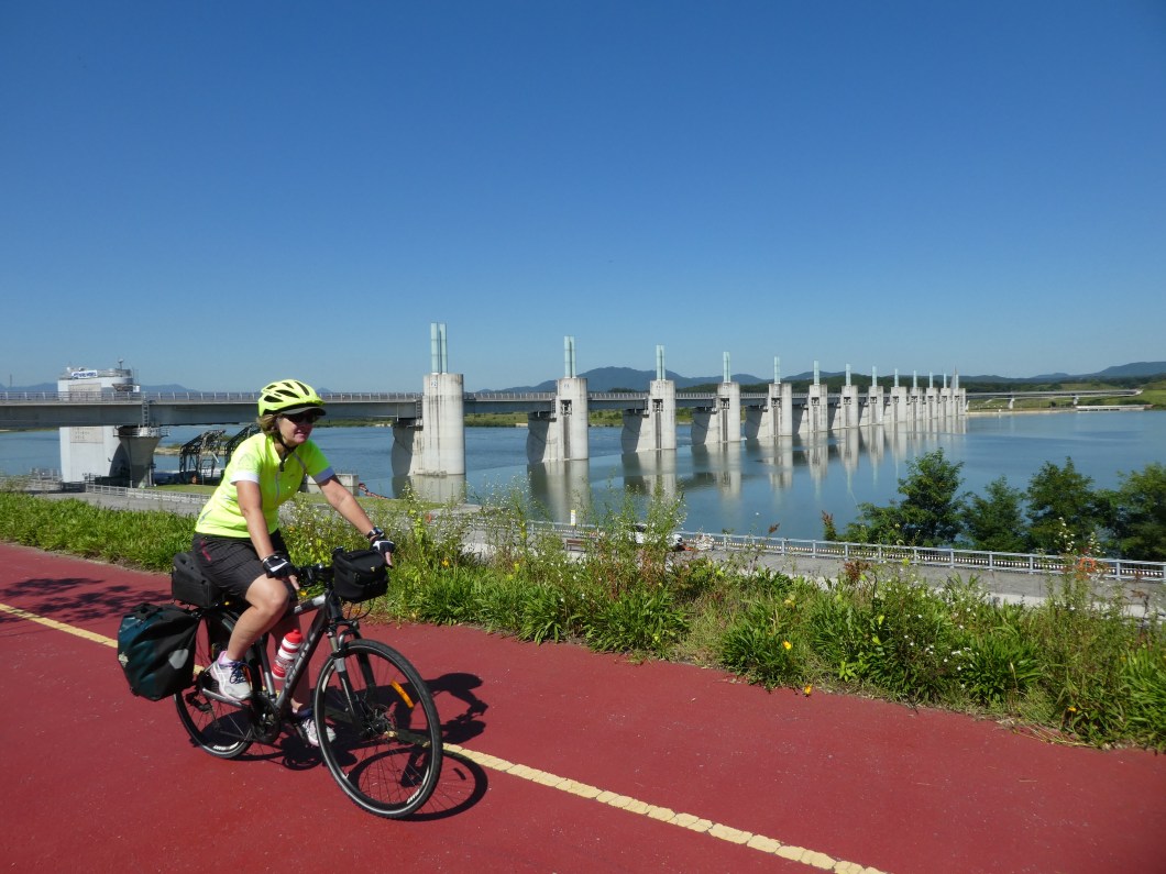 At the Suanbo stamping station. These 2 70 + year old Korean guys had been riding with us , And as always Korean cyclists value the chance for a photo. Rose and Barb were happy to stop and as chance would have it , a large hotel was only metres away .