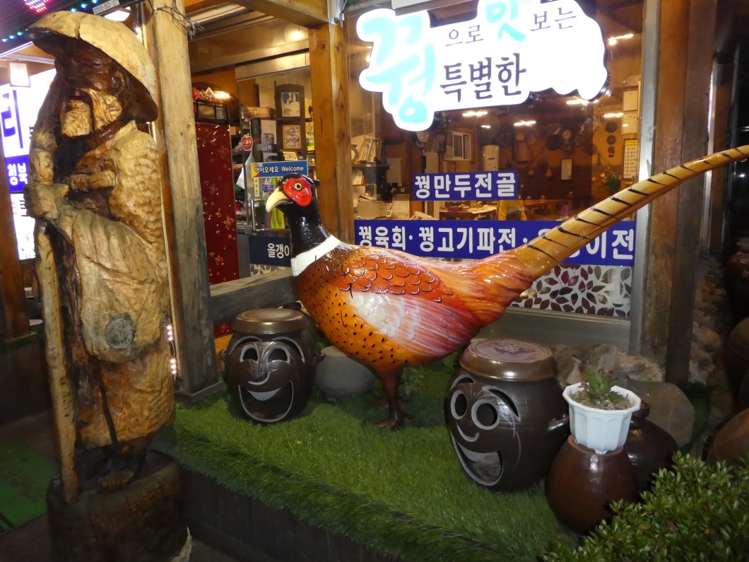 Checking out Suanbo , lots of bright lights and plenty of pheasant restaurants . Most ( 95% ) have only low tables and no chairs so we had to walk till we found western style tables . Had a fantastic Bibimbap