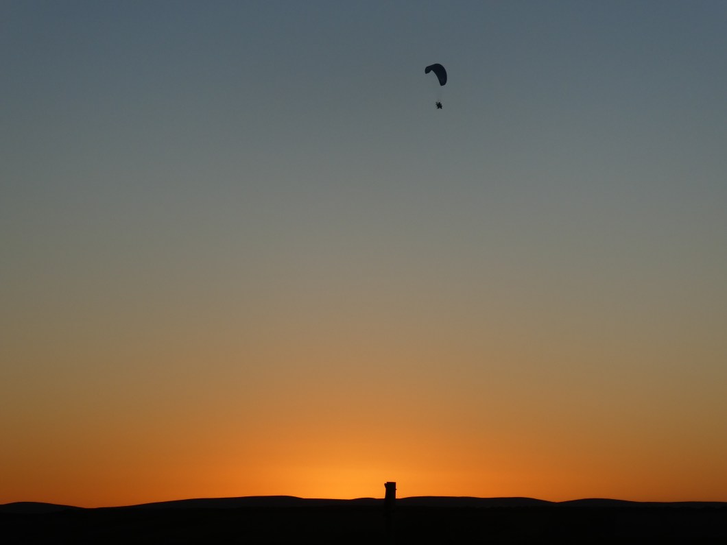 Had an early departure, 5:30 am from Lyndhurst in the chill of the pitch black, with every bit of warm clothing I possessed . Roos startled by my bright light were plentiful but with my conservative pace in little danger as they crossed and double backed over the road . Passed a keen group of three guys flying motorised parachutes as dawn broke . The sides of the road are littered with white bones of long ago road kills and plenty of odiferous more recent fatalities.