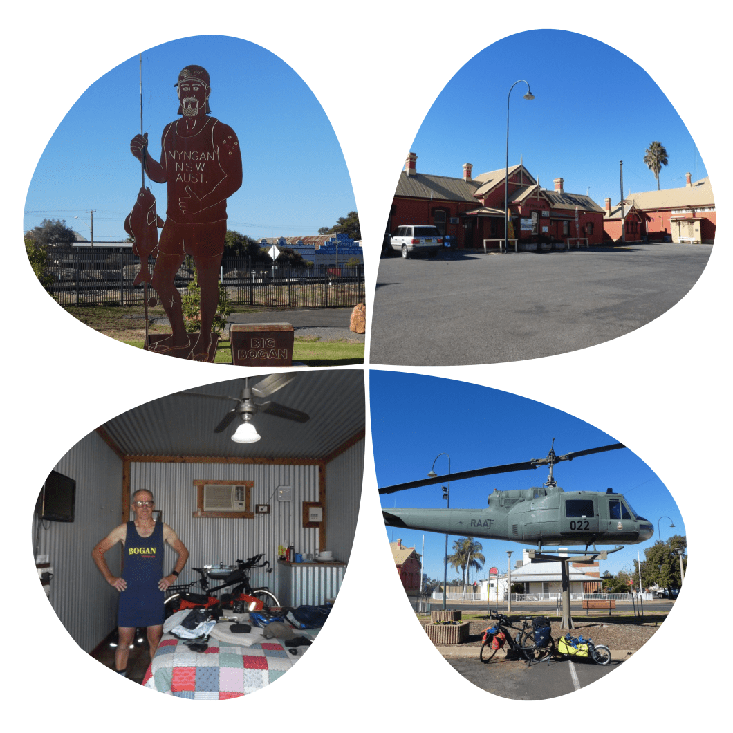 Day finished in this nice little town on the Bogan river . The expression Bogan and it’s doubtful disrespectful use , apparently only surfaced in the 1980’s due to some tv programme or other . Nyngan has been on the Bogan though for ever . The town has some notoriety due to the huge flood that completely wrecked the town in April 1990