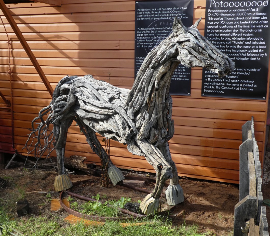 Tambo is a quiet little town , with quaint old buildings , some nice cafes and a woman with this obsession for creating wooden horse sculptures.