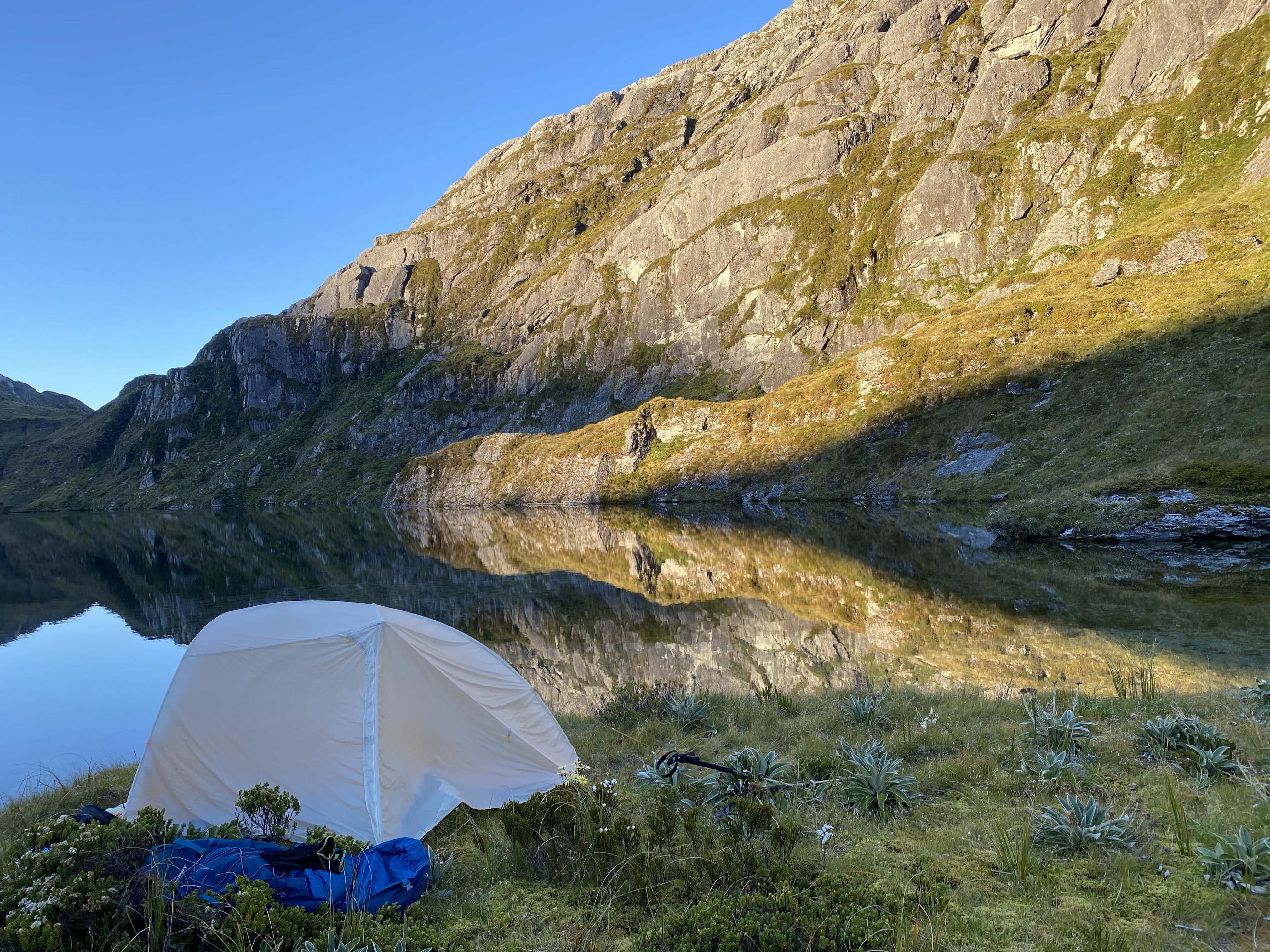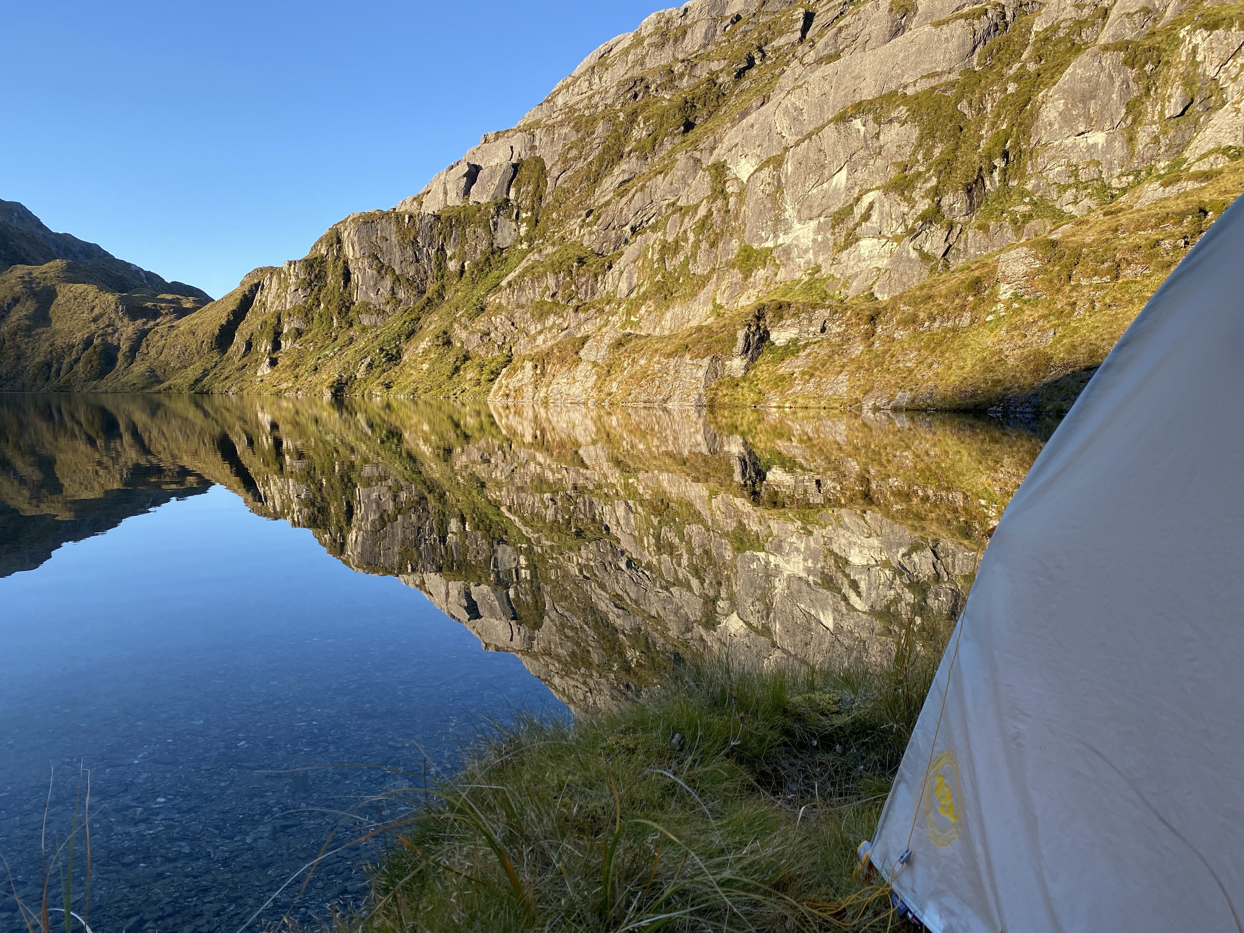 When I finally made it to Lake Harris I found the small side track that skirts the western side and found a perfect tent site eventually on a luxurious bed of thick moss . So thick and comfortable that I didn’t need an air mattress