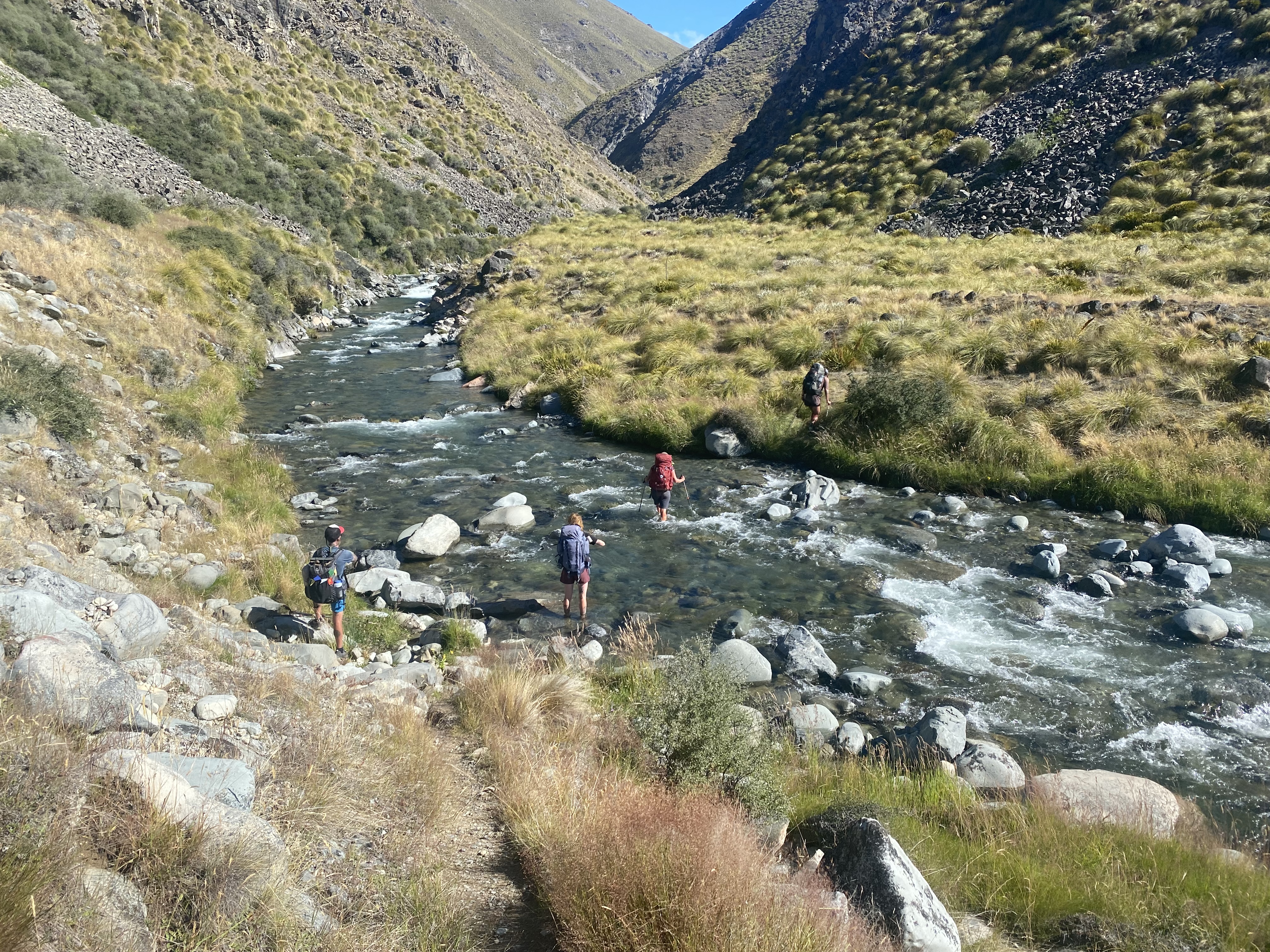 The last part of the walk was a 9 km section thru Bush Stream , rather high from recent rain and we decided as a group to stick together to provide security / safety for the many crossings required . This involved the classic loosen packs the form a line of 3 holding on to your neighbours pack straps . In the fast moving current this proved invaluable as we negotiated some tricky currents