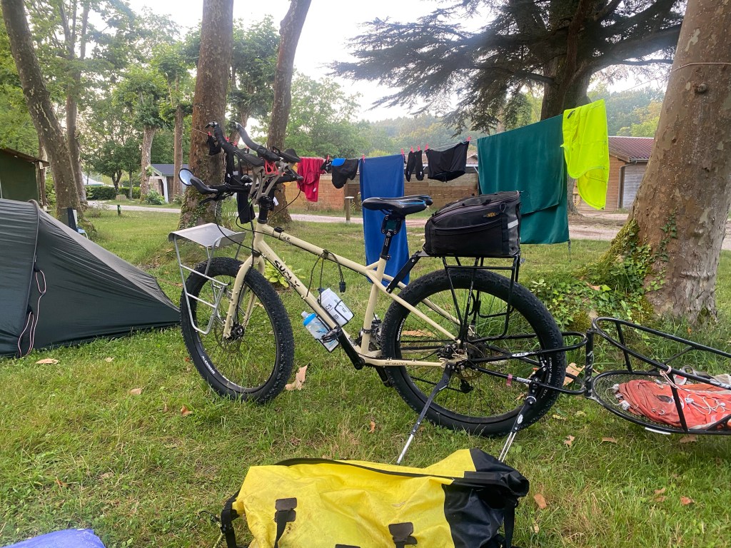 Fortunately the near bald old Surly tyre held up despite a huge inner tube bulging out the sidewall , and I was particularly happy to see a new replacement tyre waiting at John’s . Was not so easy to source from within France but I found a supplier from Germany .