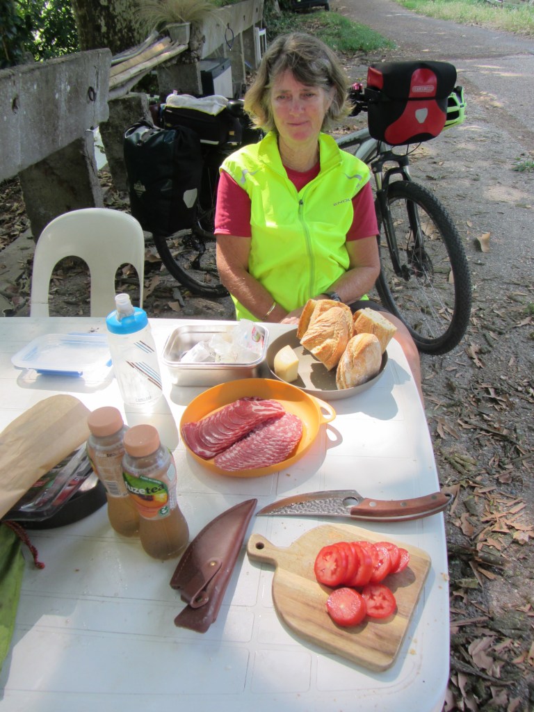 Had our first serious mechanical issue this day wth a rear flat tyre and and obvious hole in the sidewall . This meant stripping the bike down to turn upside down for finding and repairing the flat . This was very frustrating as we had more than one hole . No sooner had we got going again than the tyre was flat again . After the third stop I abandoned the attempt to patch and put my brand new spare tube in and this time it held .