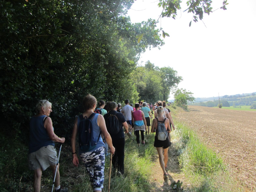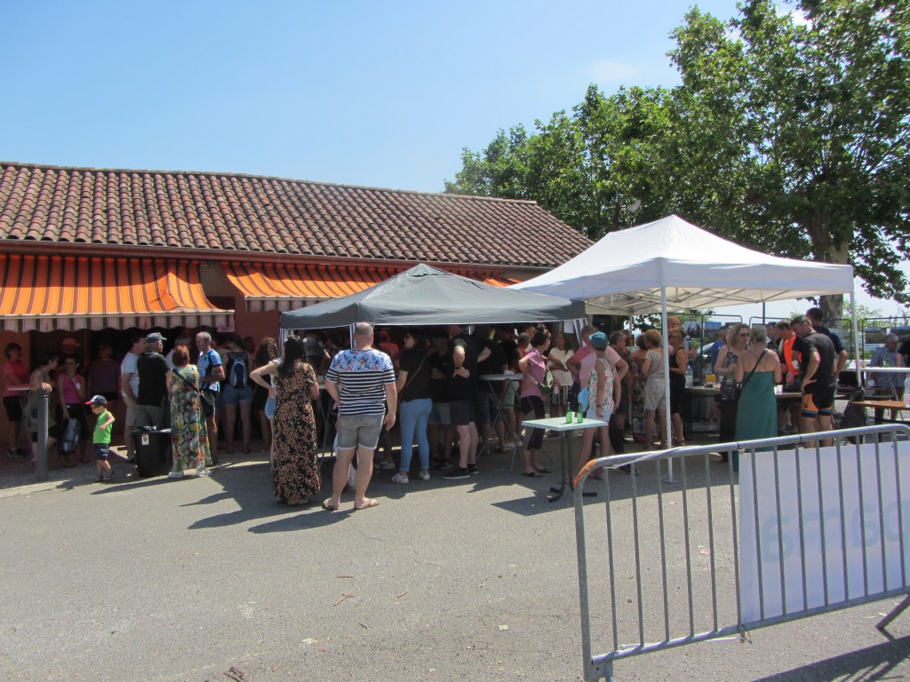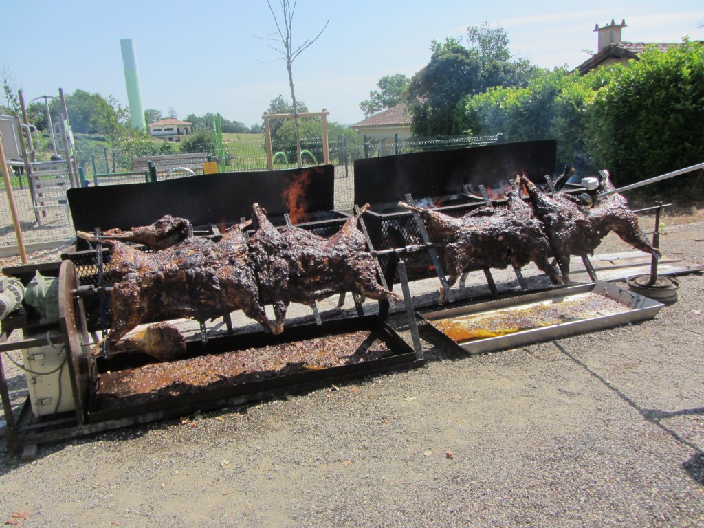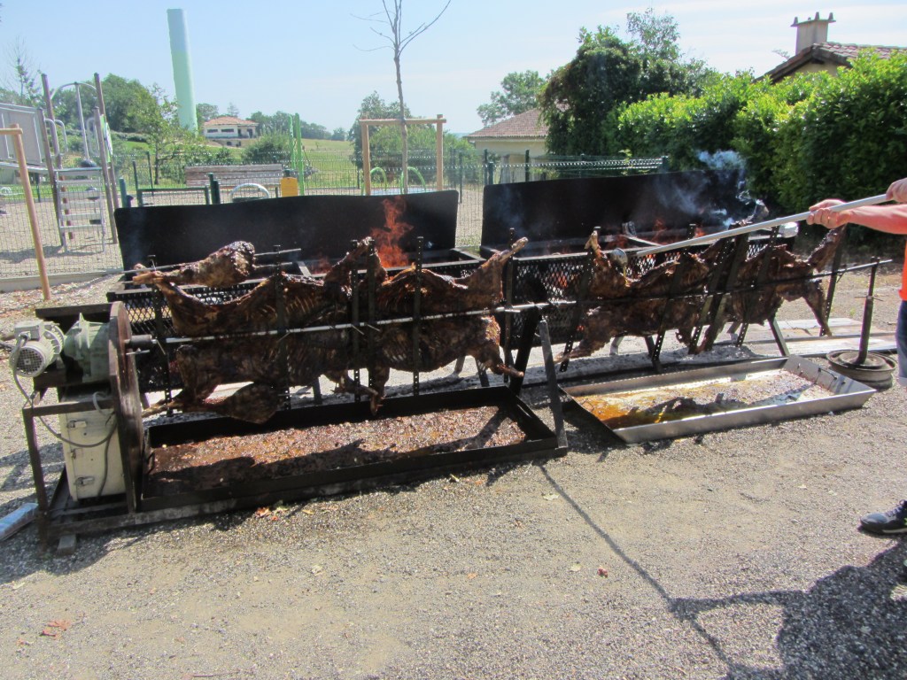 We took part in a community event that involved a 10 km walk meandering over local farmlands with about 100 locals and ended up with a wild boar spit roast lunch at the town centre of Castillon-Debats Debats .