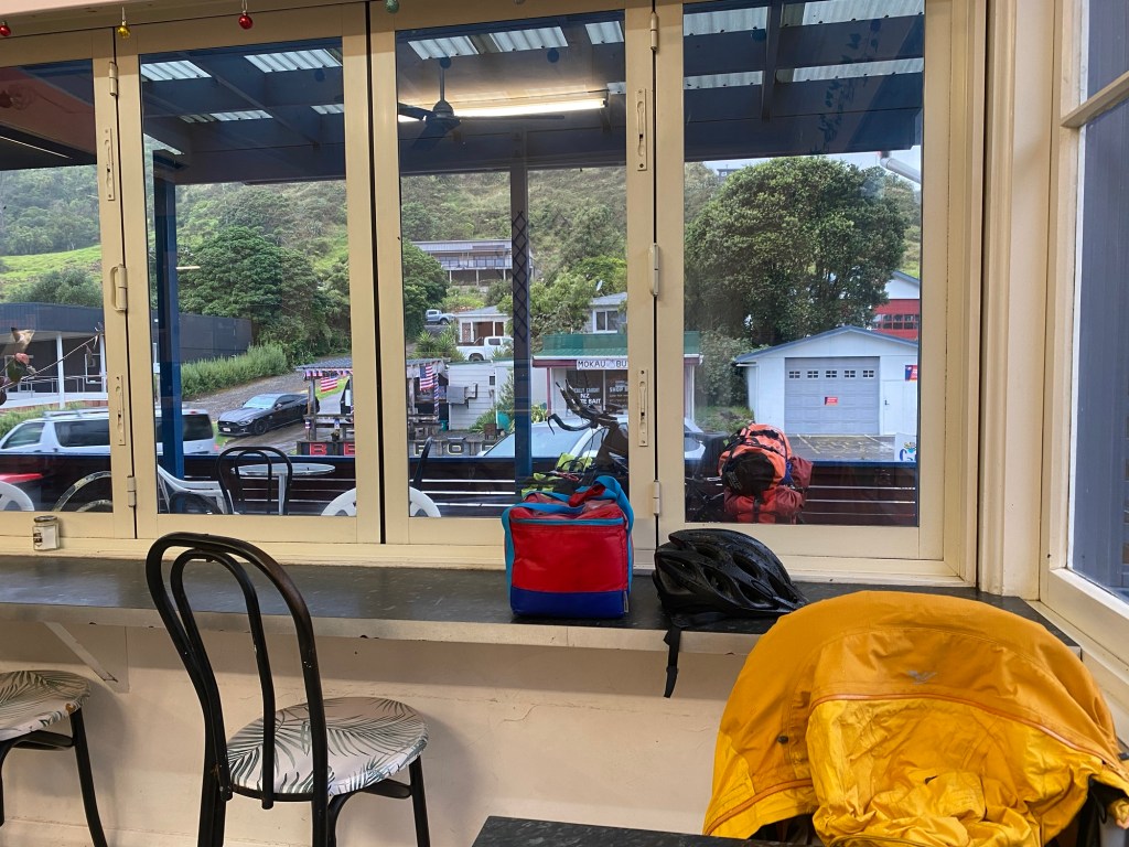 With ominously dark cloud banks and rain threatening I packed up my camp all in the dry , and departed the few kms into Mokau , the home of the whitebait fritter , perhaps the most overrated kiwi delicacy there exits .The rains had started as I left the camp and I had a good drenching before I settled into the cafe ordering a big carnivores breakfast. Was a good move as the rain did stop and eventually I was off , contending with heavy traffic for 35 km before again turning off into the backroads . Destination Whangamomona the self proclaimed independent republic .