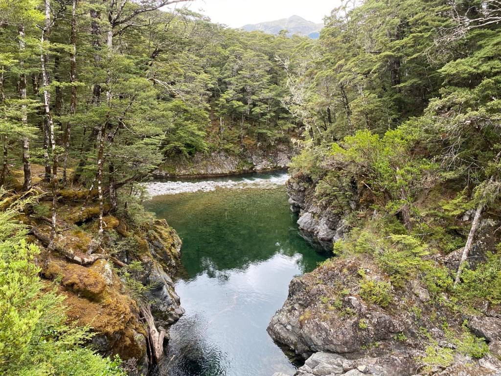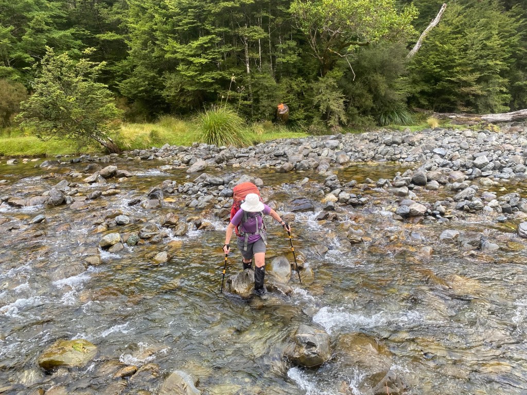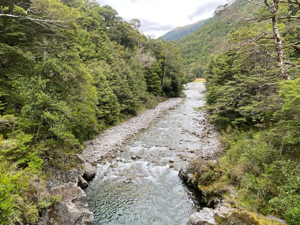 As downwards pace could generously be described as geriatric as we shuffled our way down . It was with some joy and relief that we finally made it to the Doubtless river close to 6pm . . We were initially intending to make it all the way to the nice Doubtless hut but that was another 100 minutes walking away and we were pretty stuffed .