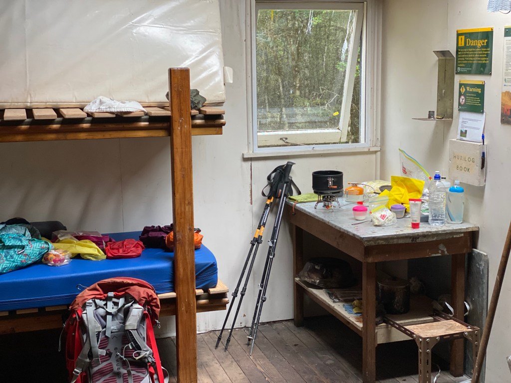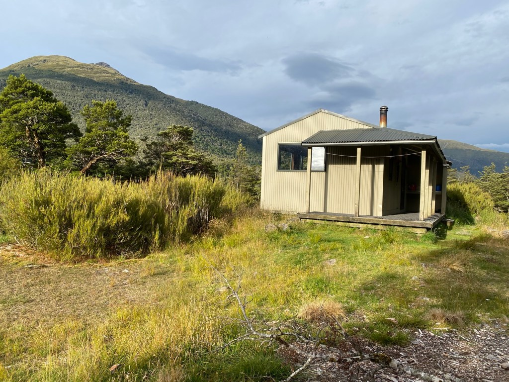 The backup was the small very basic DOUBTFUL hut that was a mere 100 metres away . Exhaustion made the decision for us and we thankfully moved in to the small 3 berth hut . Barely room to swing a cat but we accepted the shelter with gratitude. Bit like a garden shed in size with a very broken down leaky door that had seem better decades or centuries past . Sandflies absolutely legend .