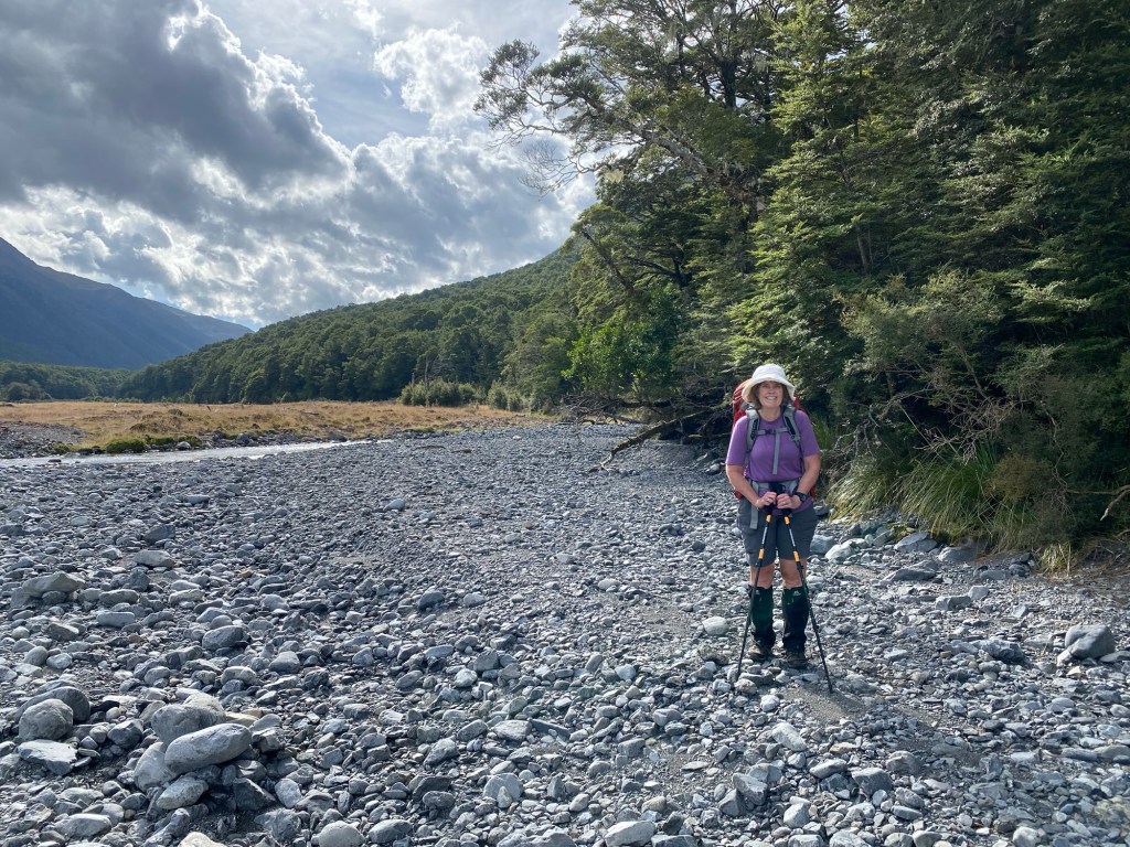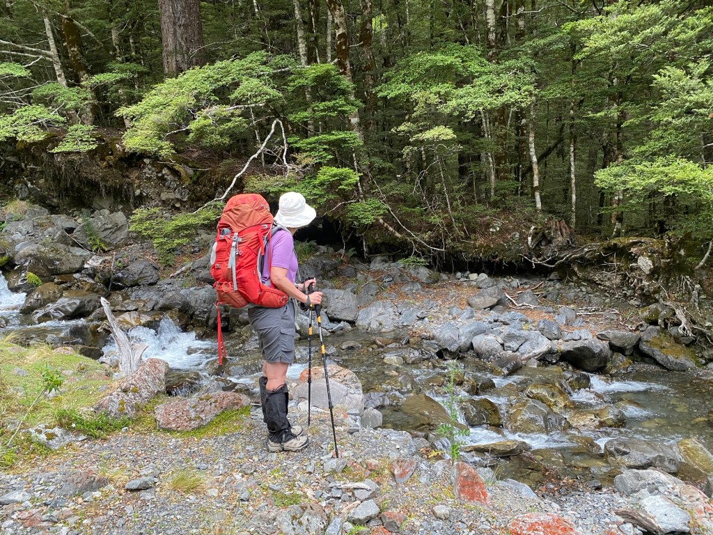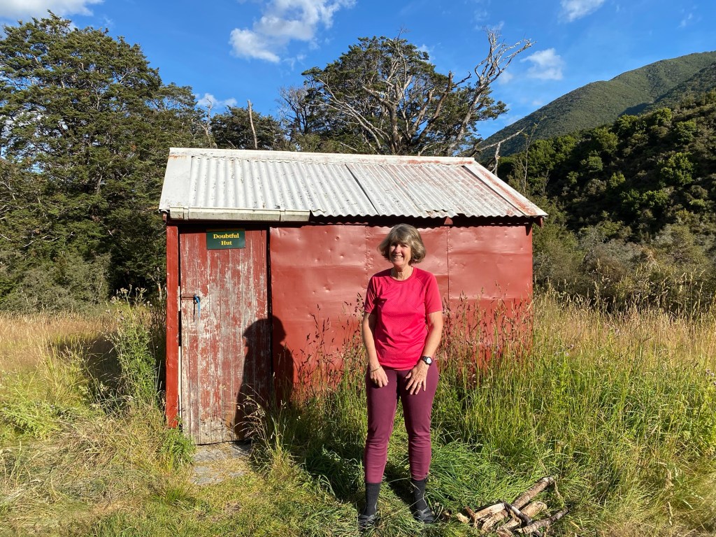 We left the little Doubtful hut for a delightful 2 hour walk upstream to the Doubtless Hut . We somehow became separated again after Barb took a high water flow deviation off the main track and we lost some time before reuniting. We had some frustrating words .