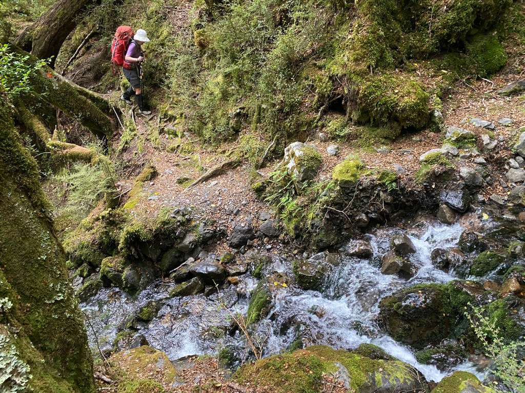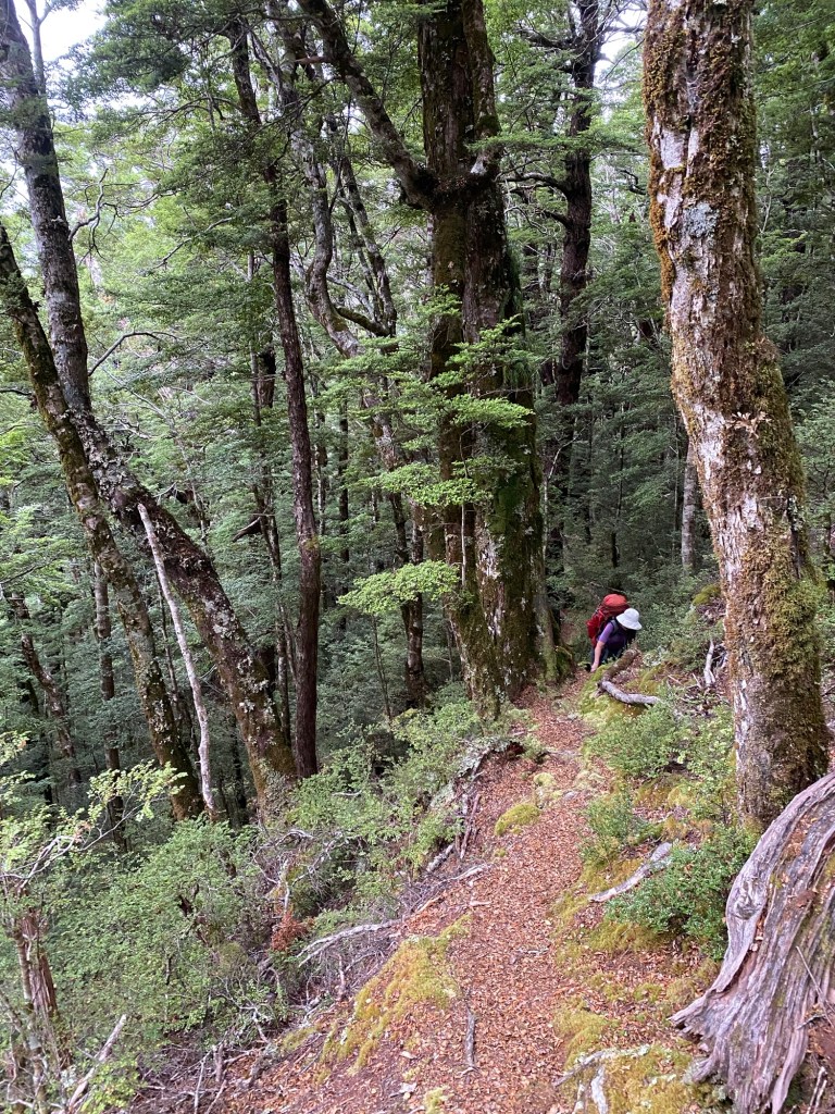 The descent was signed for 3 hours but this was an impossibility for us . We finally made it to the valley floor near 6pm . The track is in rather serious disorder and would need men with chainsaws to deal with tree falls that block the track and cause lots of time lost . Track markers on the upper region were sometimes hard to find due to overgrowth particularly in dense fern patches . We last some time when Barb got lost , “ bushed “ when she lost the track . It took some time for me to realise I hadn’t seen my faithful shadow for a time . I backtracked eventually and lots of loud shouting/ calling etc established our relative positions and I was able to get her back on-track . Story of my life ! She had done the sensible thing and stopped moving and started calling . Alls well that ends well eh !